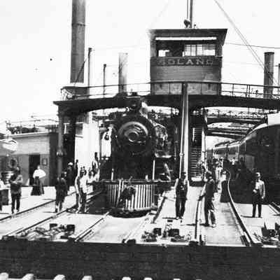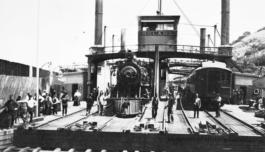 This negative is of the ferry Solano at the dock in Benicia. The trains are onboard and passengers and crew are standing around.Collection