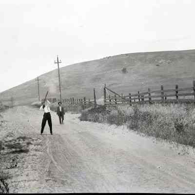 This is a photo of two men shooting a shotgun on a country road.