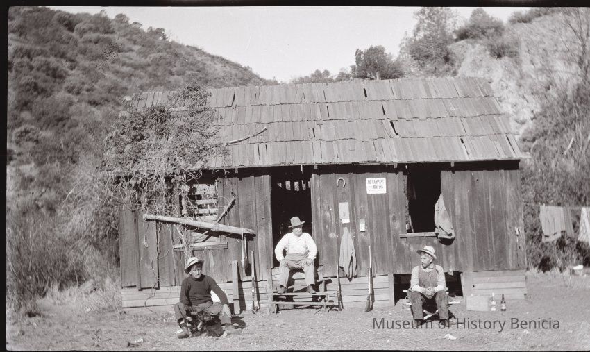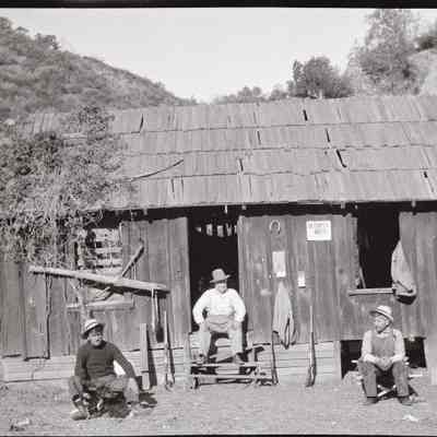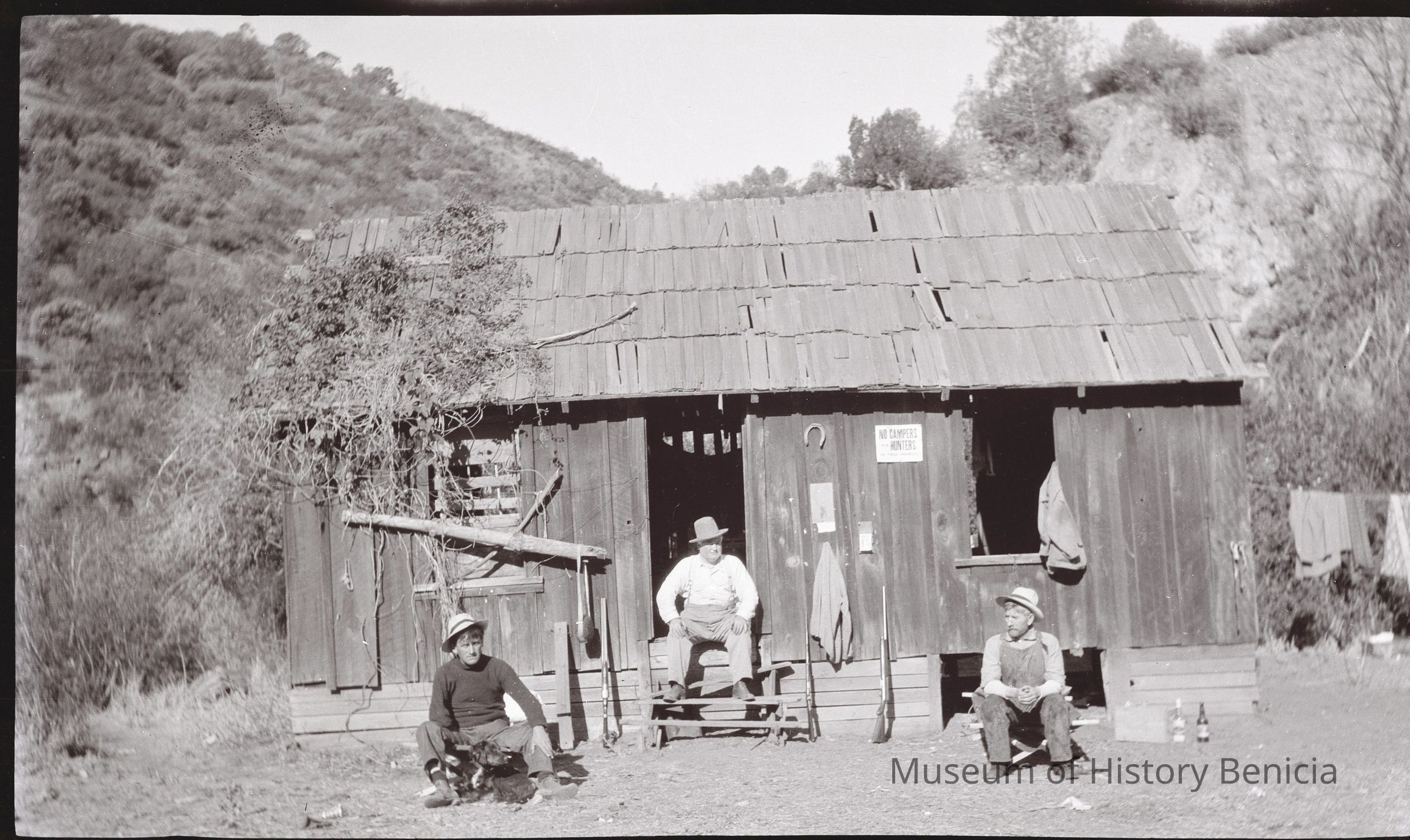 This photo shows three men outside a hunting cabin. A sign posted on the wall says the cabin is not for campers.