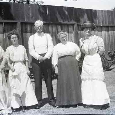 Several women and a man in a backyard. Three of the four women are wearing a ribbon.