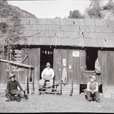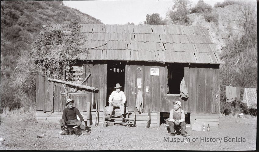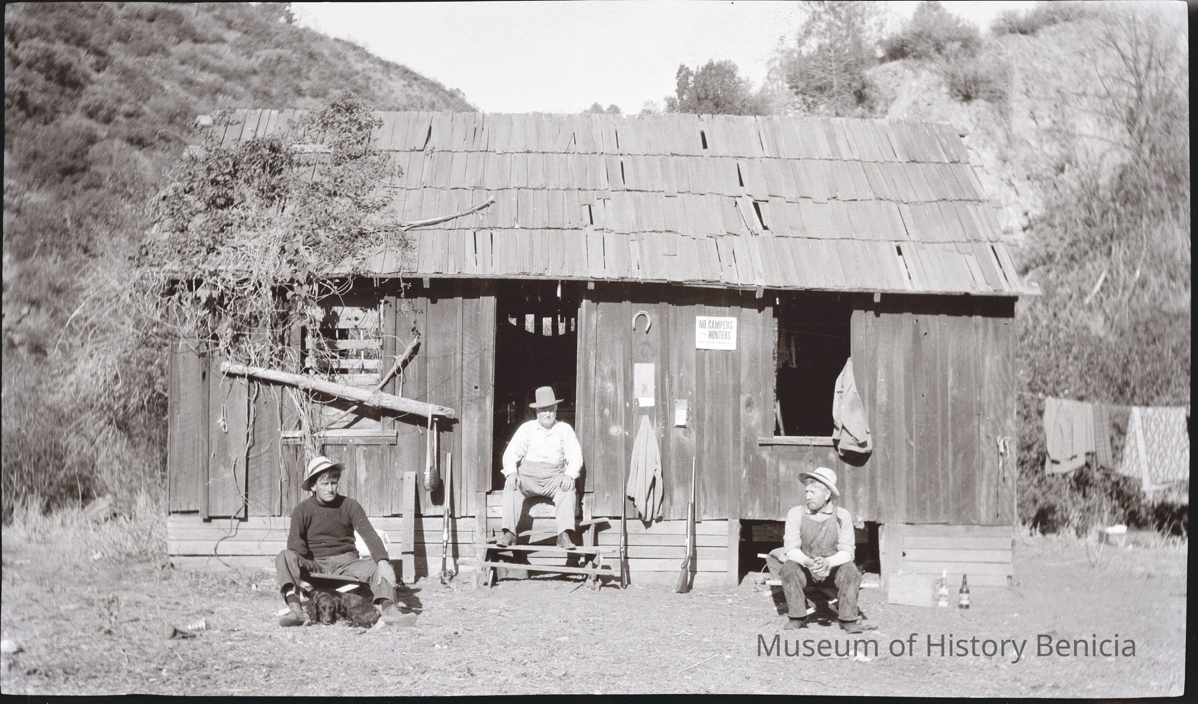 This photo shows three men outside a hunting cabin. A sign posted on the wall says the cabin is not for campers.