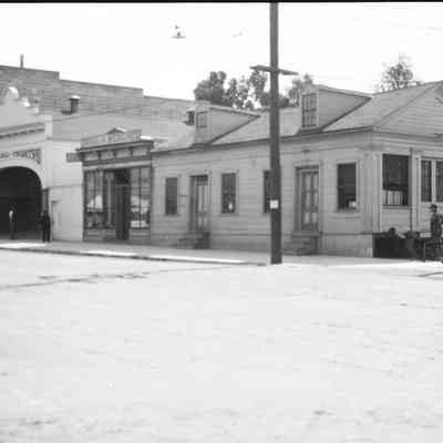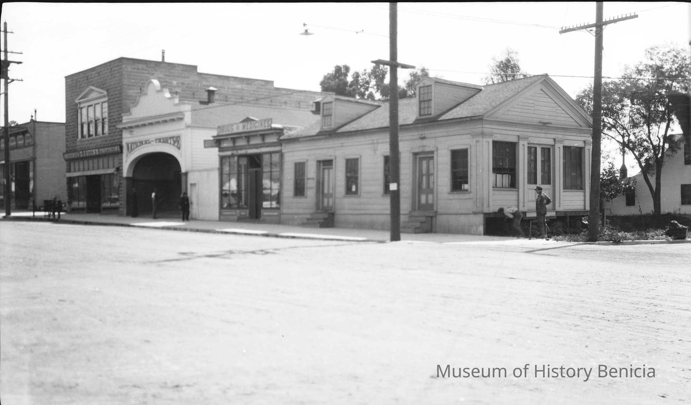 This photo shows the old Customs House after it was moved from the waterfront next to the drug store on First Street. It was here for a time and then moved down the street and became a private residence. You can see two workmen inspecting the foundation after the move. You can also see te National Theater and Quinn's grocery store further up the street.Collection