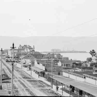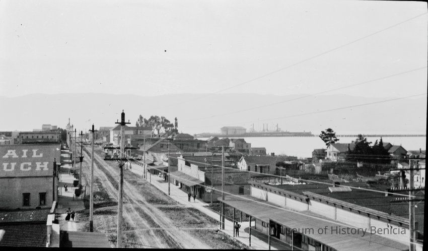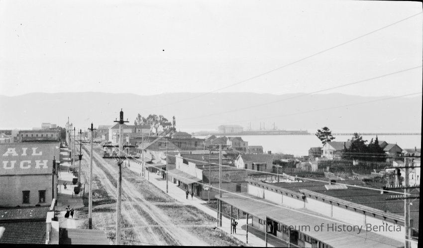 This photo shows First Street in Benicia. There was some camera shake when the photo was taken so things are a little blurry. A building on the left has a sign on it's roof the last part of the two words are "AIL" and "UCH". (Probably for the words Mail Pouch. See 2020.012.0056.) This is probably an advertisement for some product. On the right is a sign for the Anderson Hotel next to the Chinese laundry. This looks like the same viewpoint as seen in 2020.012.0050.Collection