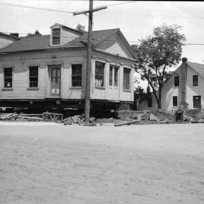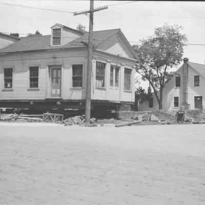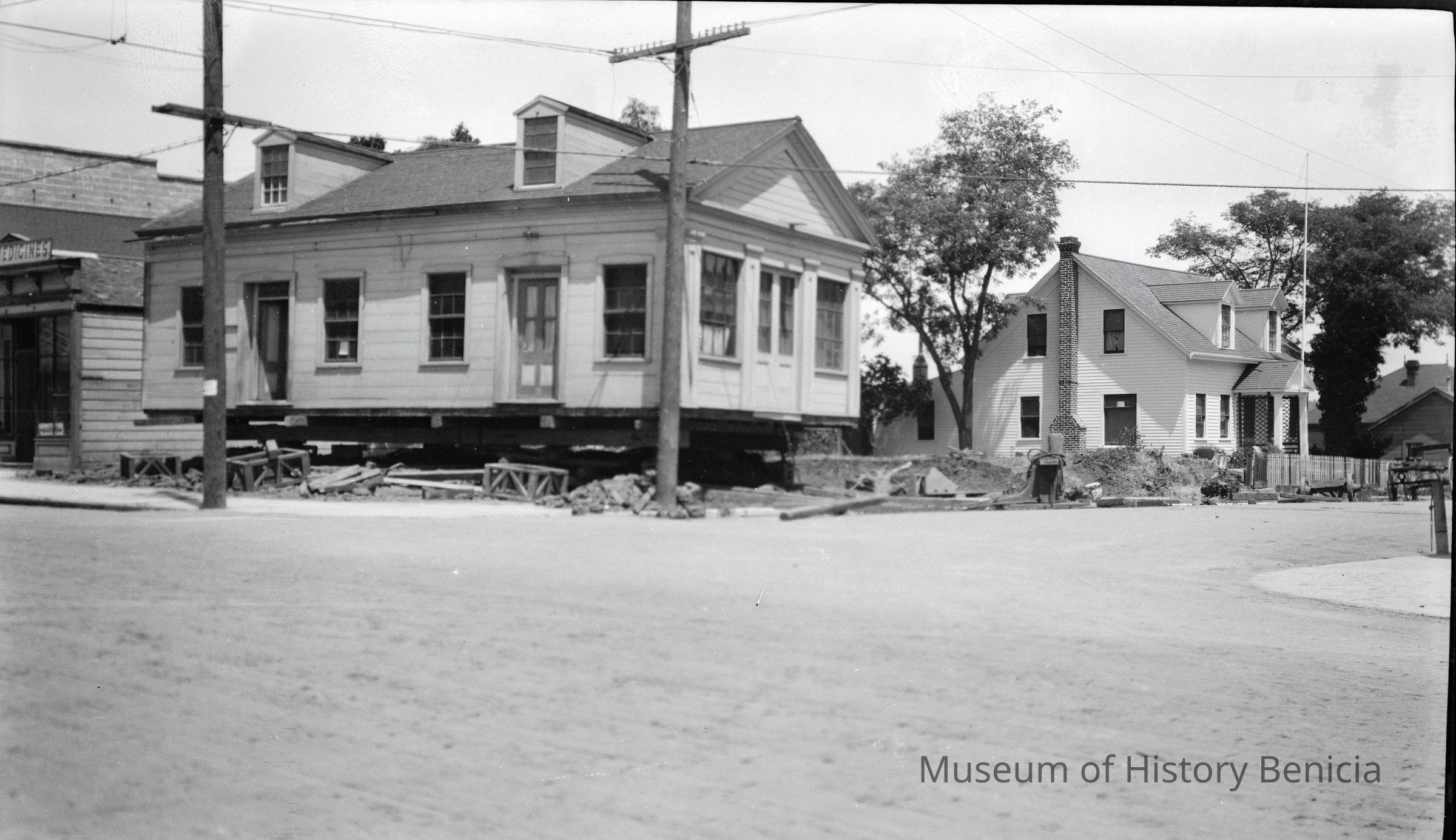 This photo shows a photograph of a house being moved. Harry Wassmann has a note with this same photo in 2017.030.00832 saying that the house is at First and "G" street and is being moved to "the other side of the dwelling, also seen in the photo". Harry raises the possibility that this may have been a Custom's house and/or telegraph office but he says he has no proof. Harry says that people by the name of Perry lived in this house during Harry's life. The house being moved was finally demolished and James Lemos built his house on the lot.Collection