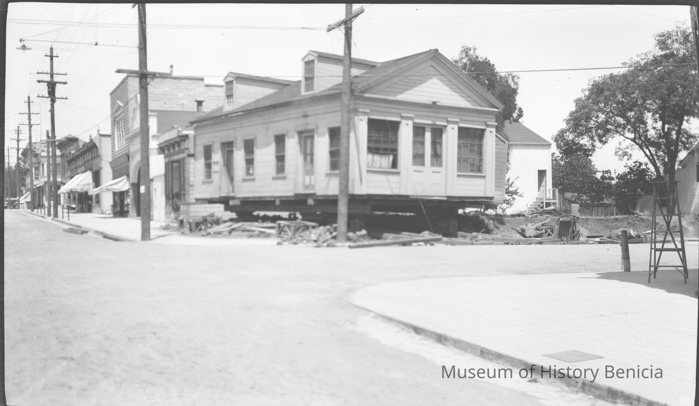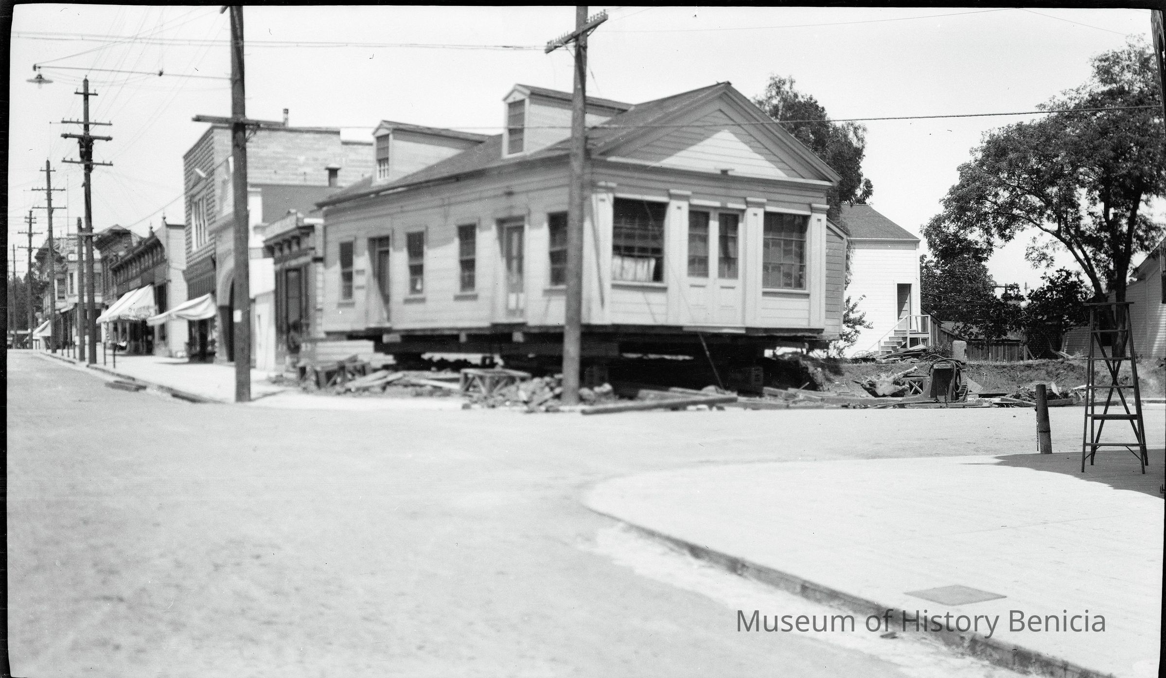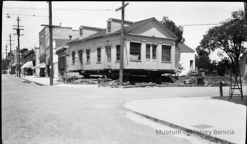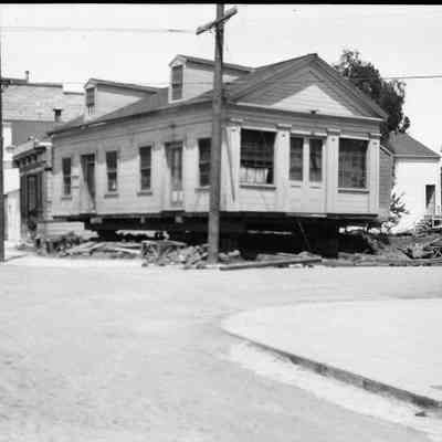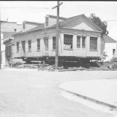 This photo shows a photograph of a house being moved. Harry Wassmann has a note with this same photo in 2017.030.00832 saying that the house is at First and "G" street and is being moved to "the other side of the dwelling, also seen in the photo". Harry raises the possibility that this may have been a Custom's house and/or telegraph office but he says he has no proof. Harry says that people by the name of Perry lived in this house during Harry's life. The house being moved was finally demolished and James Lemos built his house on the lot.Collection