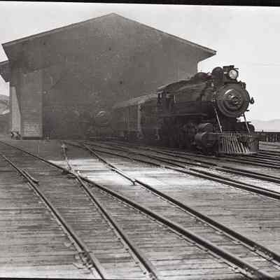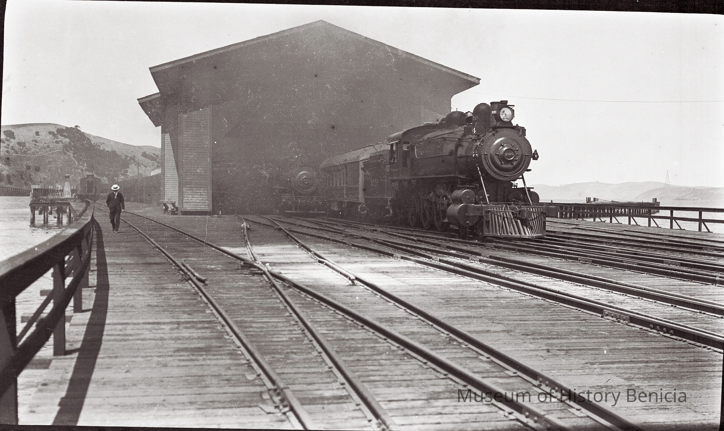 This negative is of a train on the tracks leading to the ferries. There is a man in a straw hat walking along the side.Collection