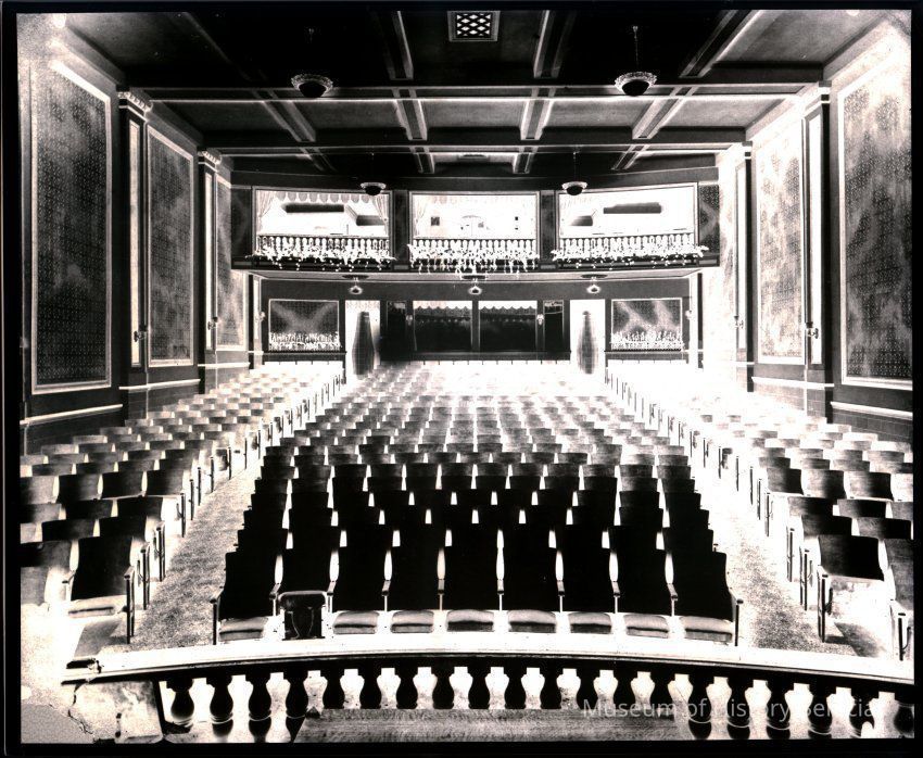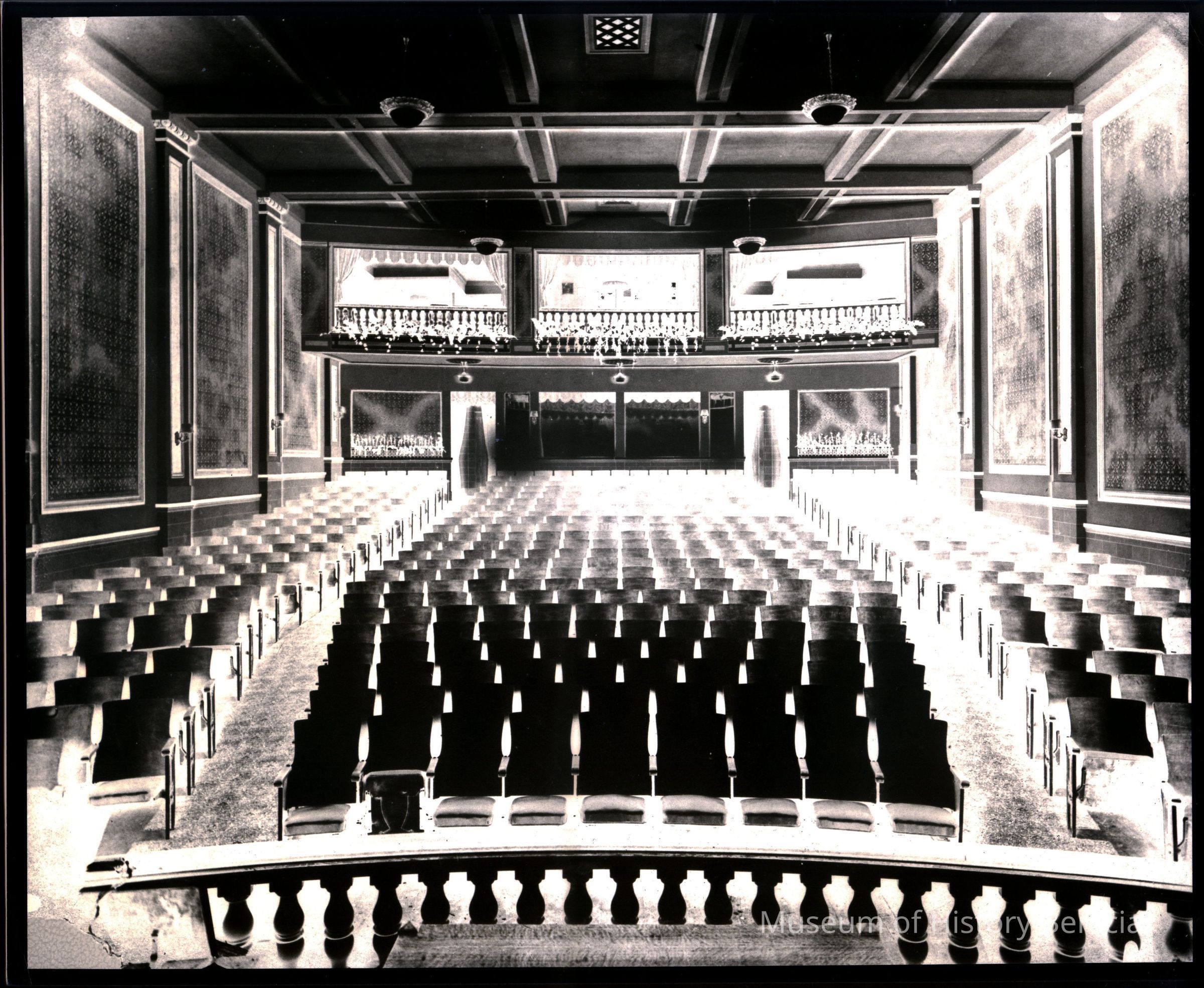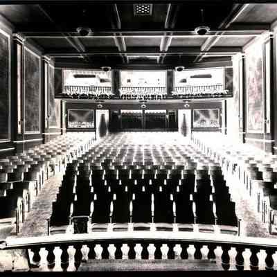 4" x 5" negative of the Majestic Theatre in downtown Benicia. View from stage of seating and balcony.
