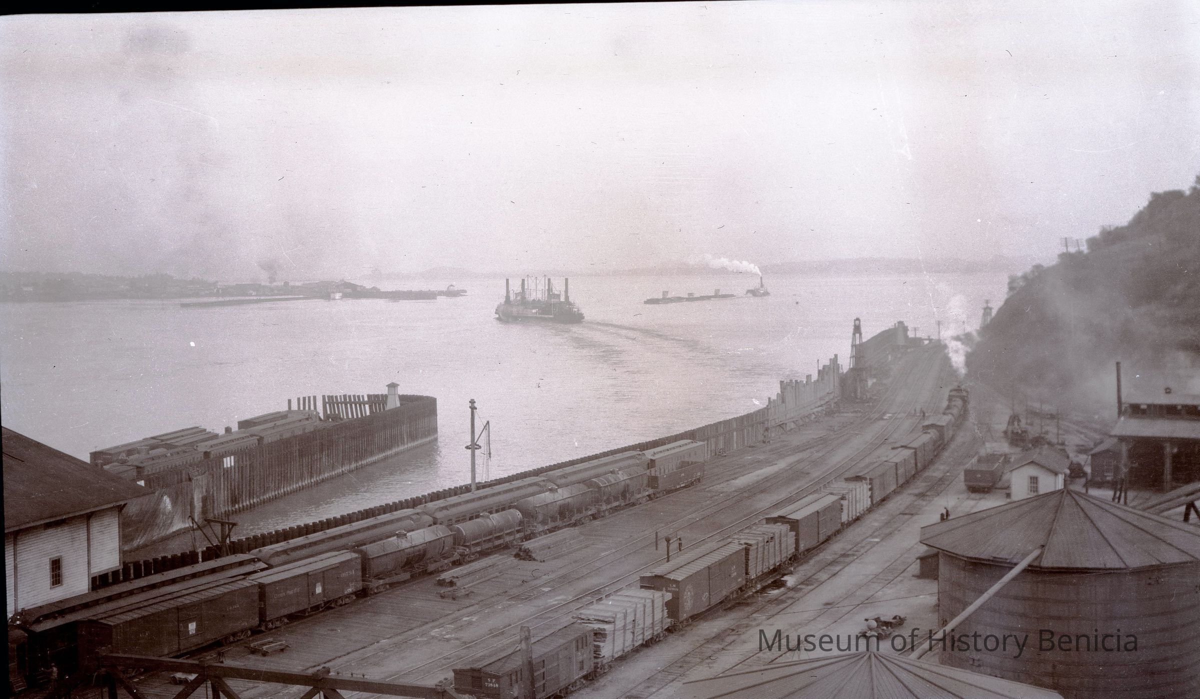 This is a photograph of a ferryboat leaving Port Costa. There is a barge in the water and Benicia can be seen in the distance.