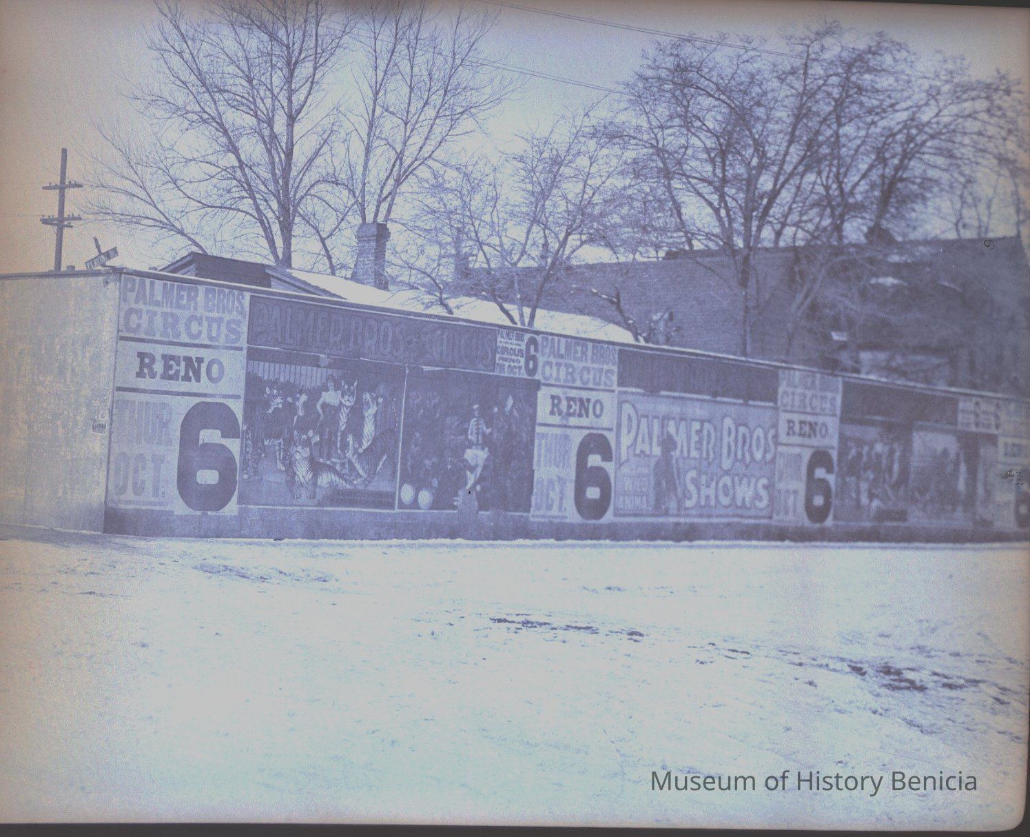 This negative shows advertizing for the Palmer Brother's Circus in Reno, Nevada.