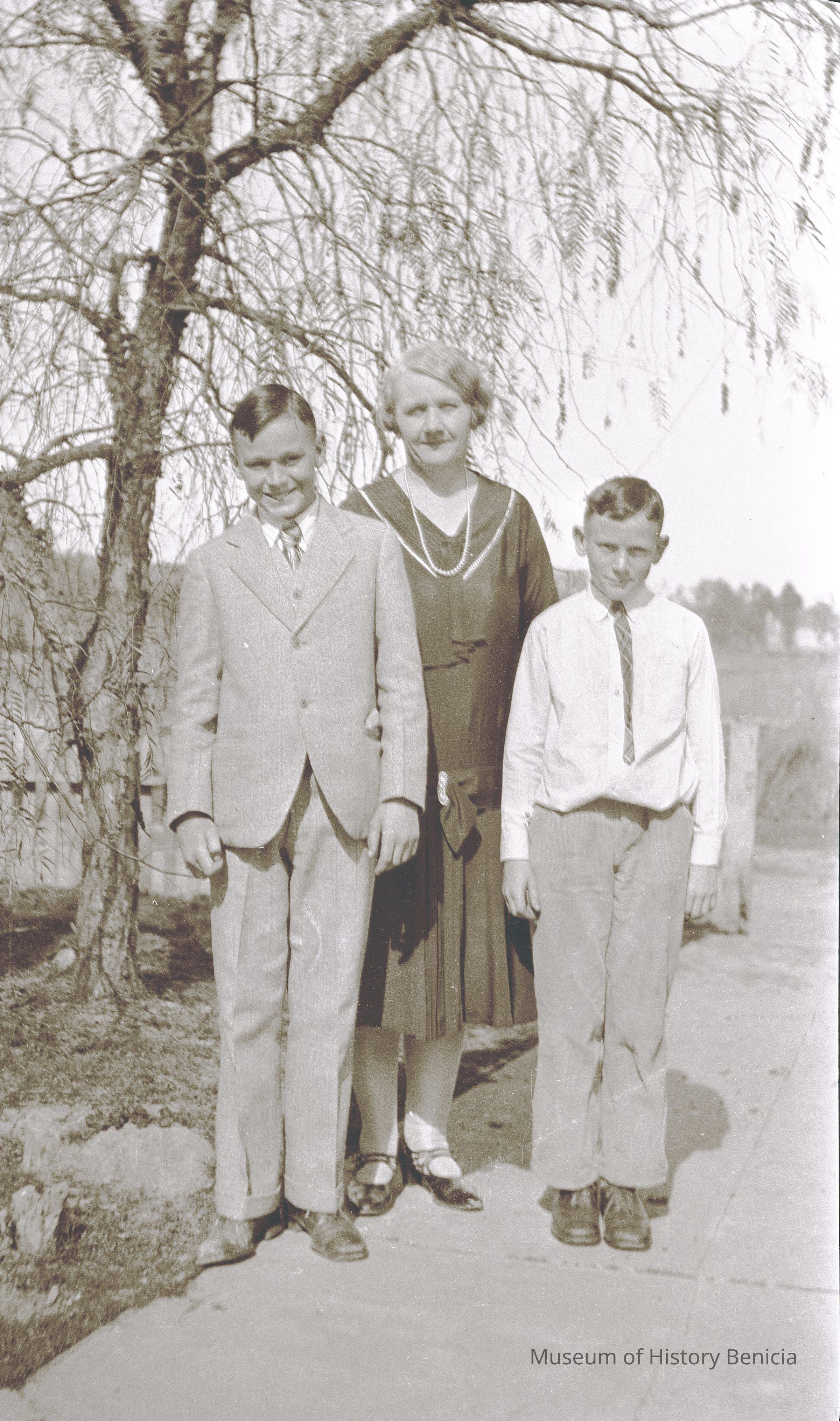 This is a photograph of two boys with a woman standing under a tree.