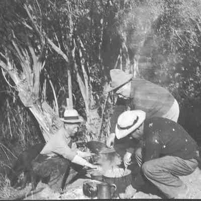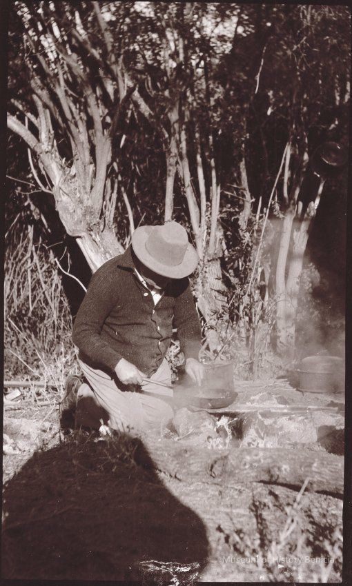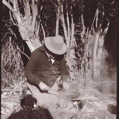 This photo shows a man cooking at a hunting camp site. You can see the shadow of the photographer.