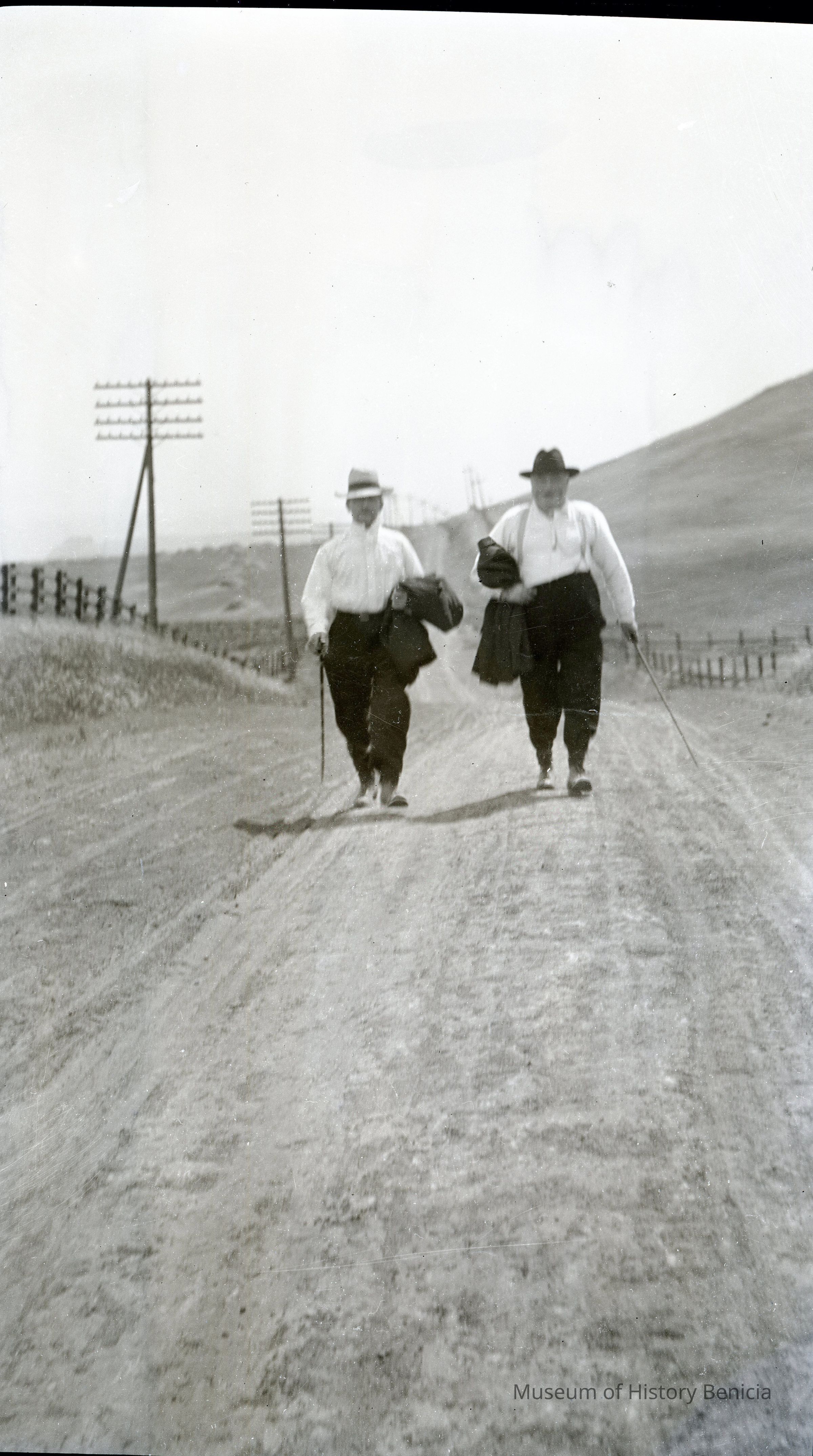 This is a photo of two men walking on a country road.