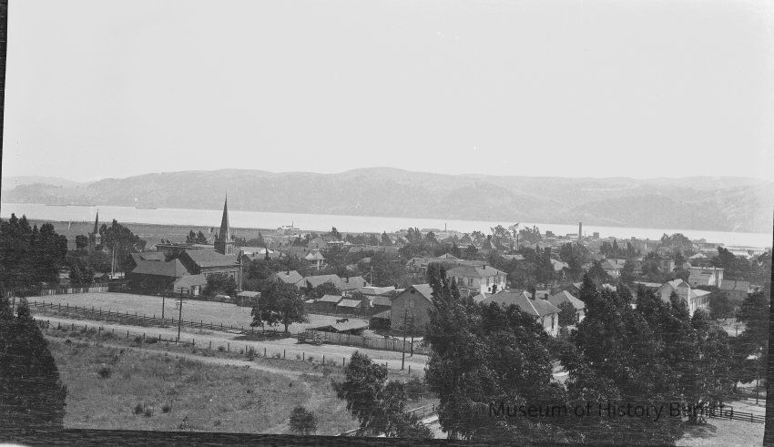 This is a photograph of Benicia looking towards the Straits. The rear of the old Congregational Church can be seen just left of center.Collection