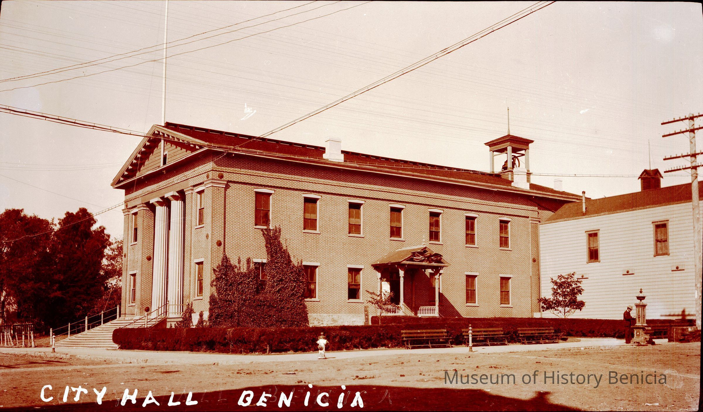 This negative is of the Benicia City Hall (Old State Capitol). It shows the fountain that used to be in front of the building with a man standing in front of it.Collection