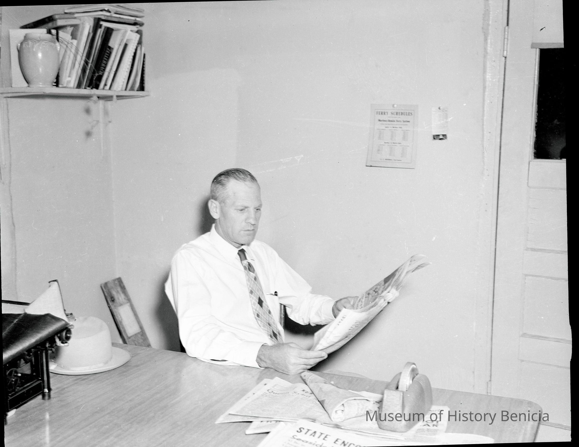 This is a photo of a man reading a newspaper at his desk. There is a Benicia ferry schedule on the wall behind him.
