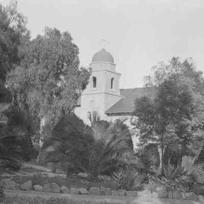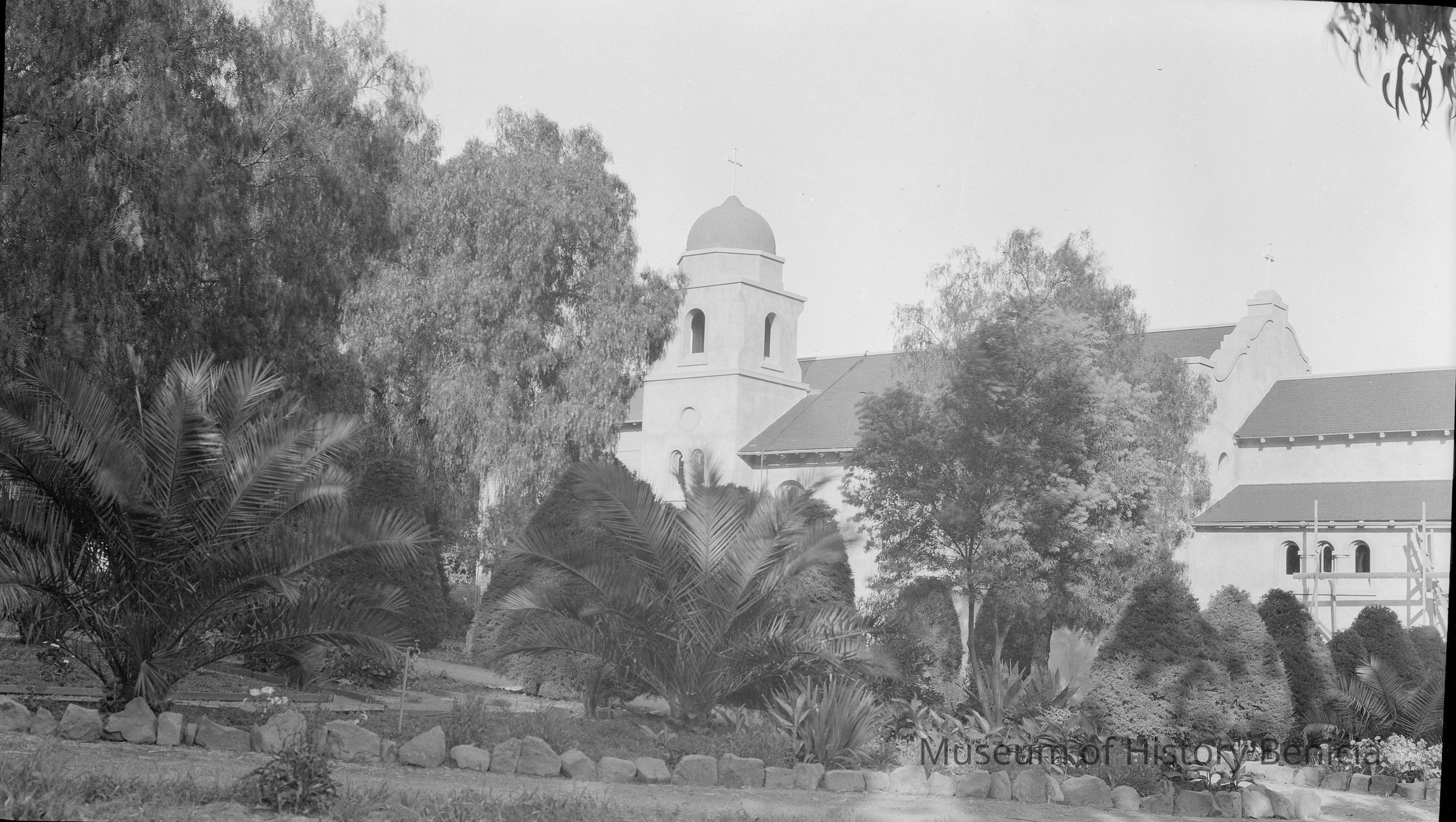 This is a photograph of the buildings and landscape at St. Catherine's in Benicia. We have a postcard of this negative 1993.055.0023.