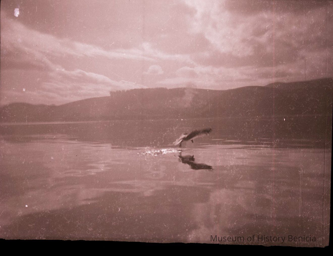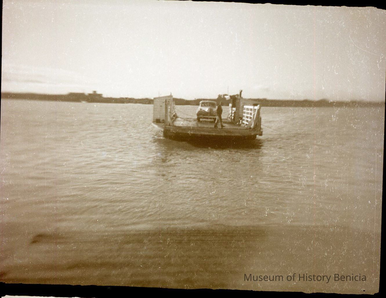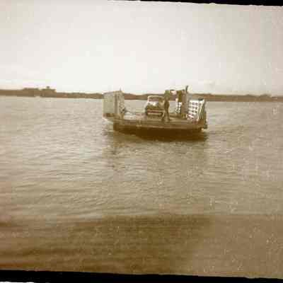 This is a double negative. There are two negatives on the same strip. One shows a boat on the water and the other a fish jumping out of the water. The boat is a small open deck ferry which is carrying a car. The car looks to be a 1940s vintage.Collection