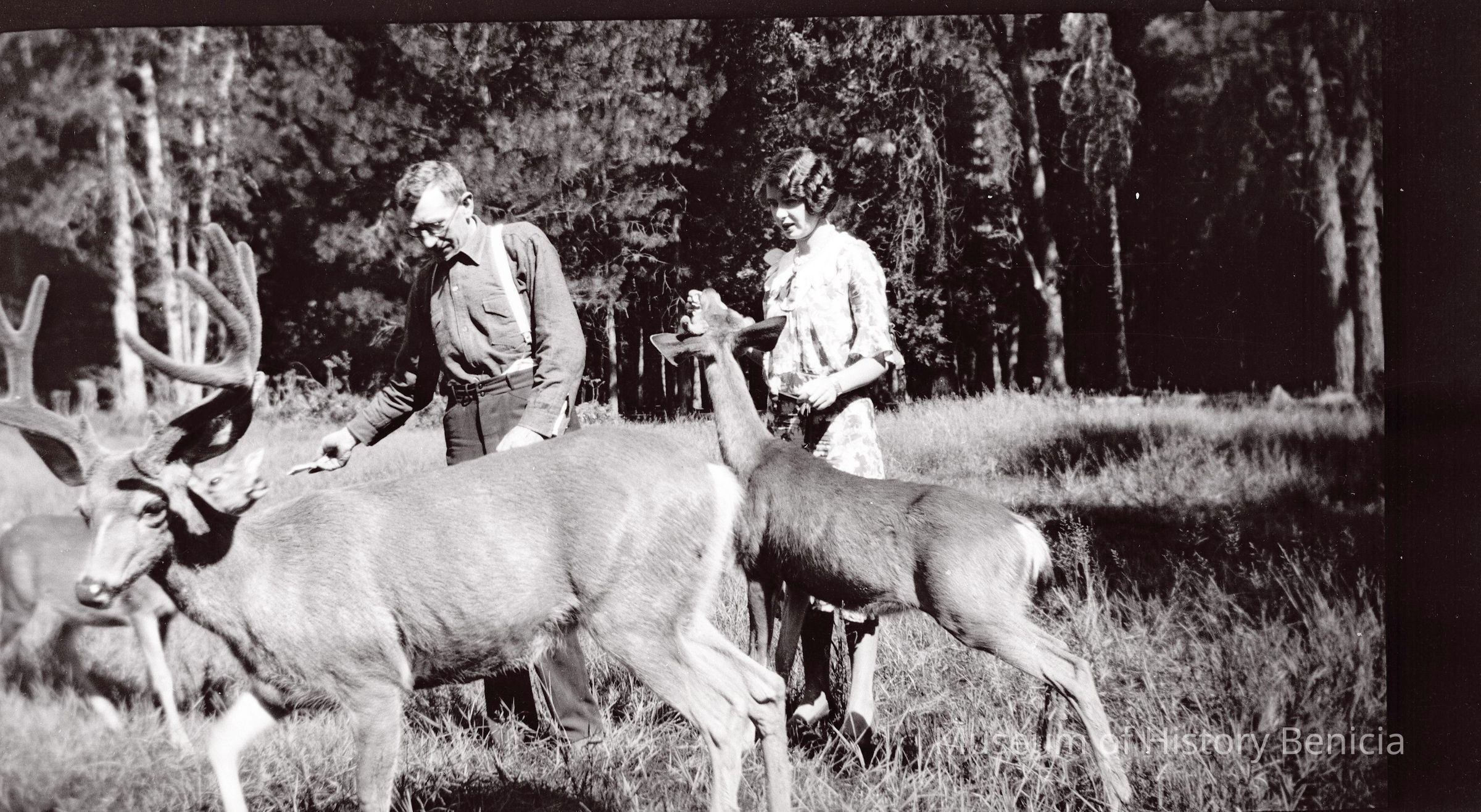 This negative is of a man and woman petting deer. The deer appear to be tame and may be pets. The Riddell-Fish family were known to keep a number of animals as pets in their back area of their home.Collection