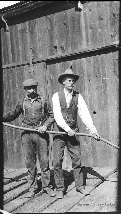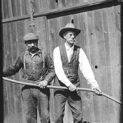This is a photo of two guys holding a hose. May be part of the fireman's drill/practice.