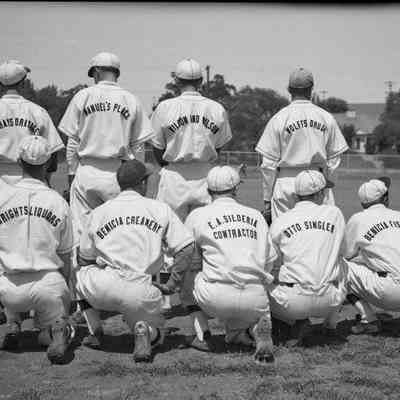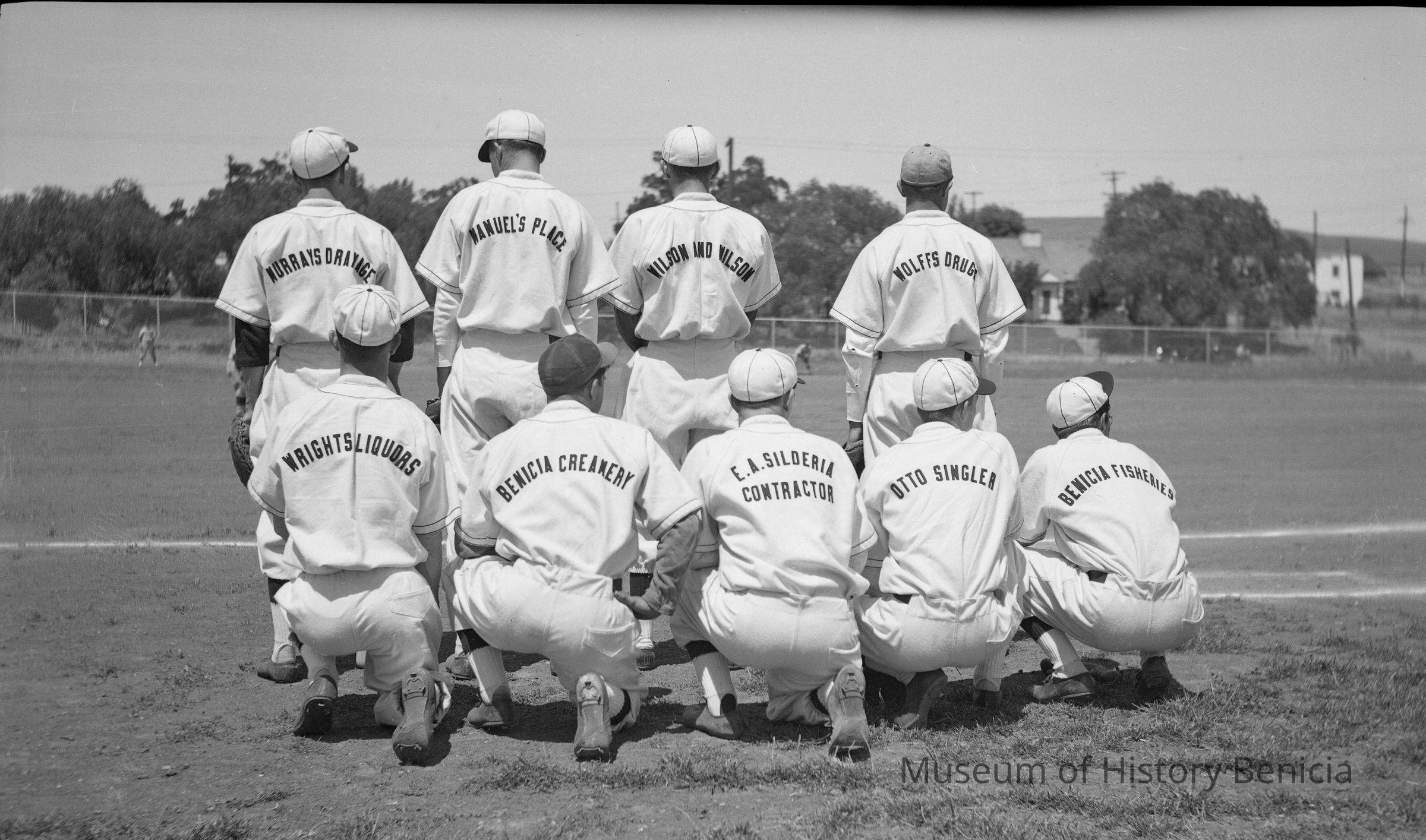 This is a photograph of the backs of the Benicia baseball players, it was probably the team known as the 'Benicia Merchants". It includes: