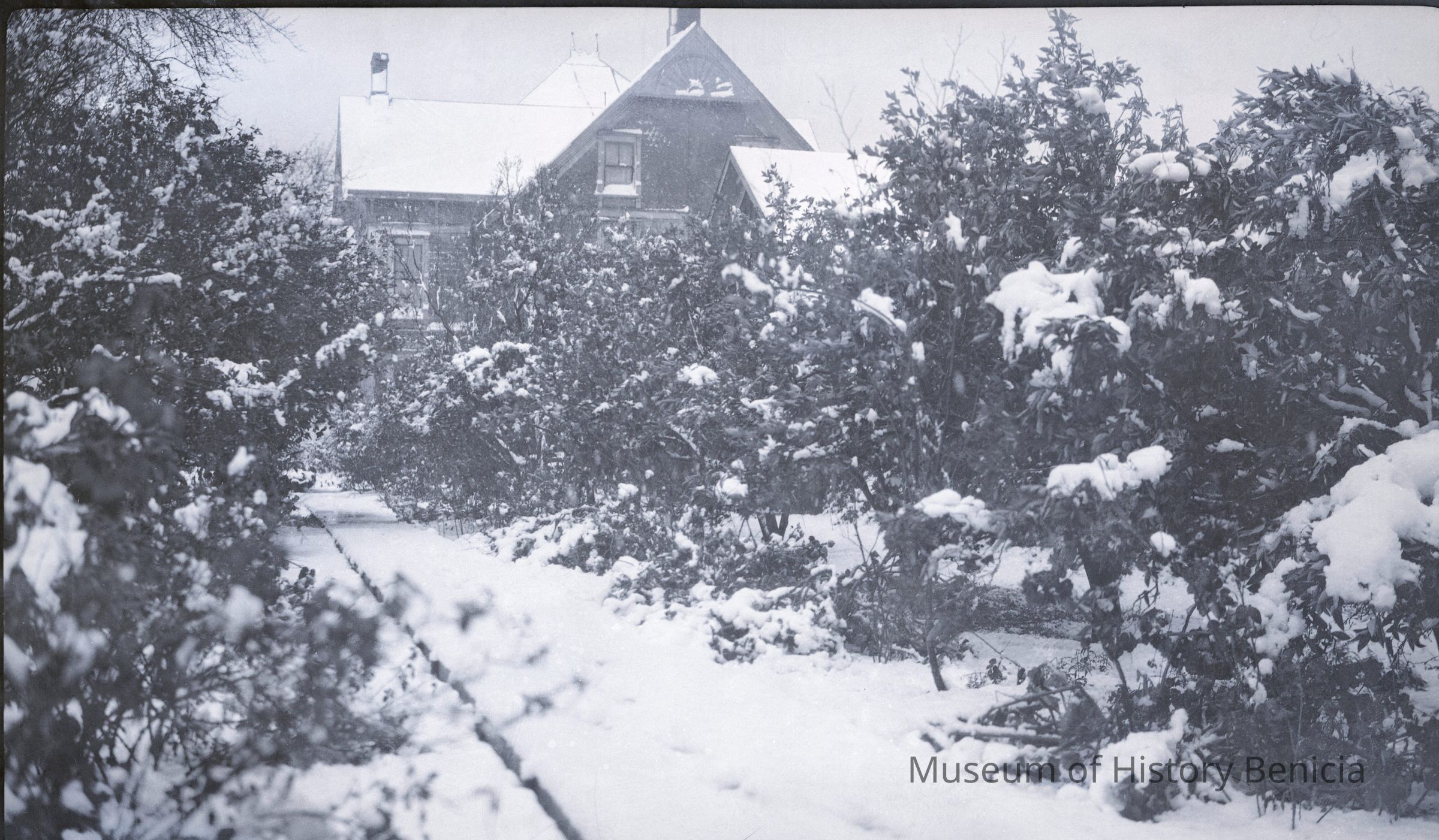 This negative shows the Crooks mansion with snow on the ground. This could be from 1913 when there are other Crook's mansion covered in snow.Collection