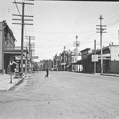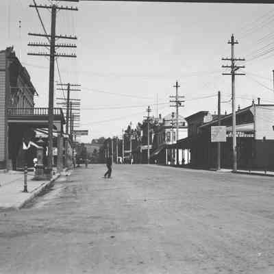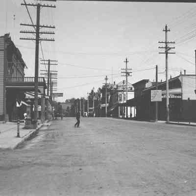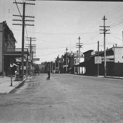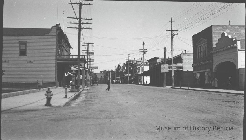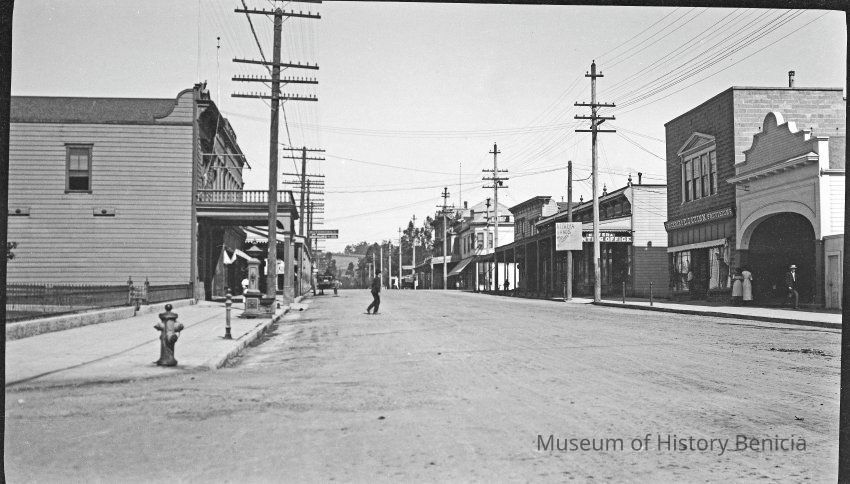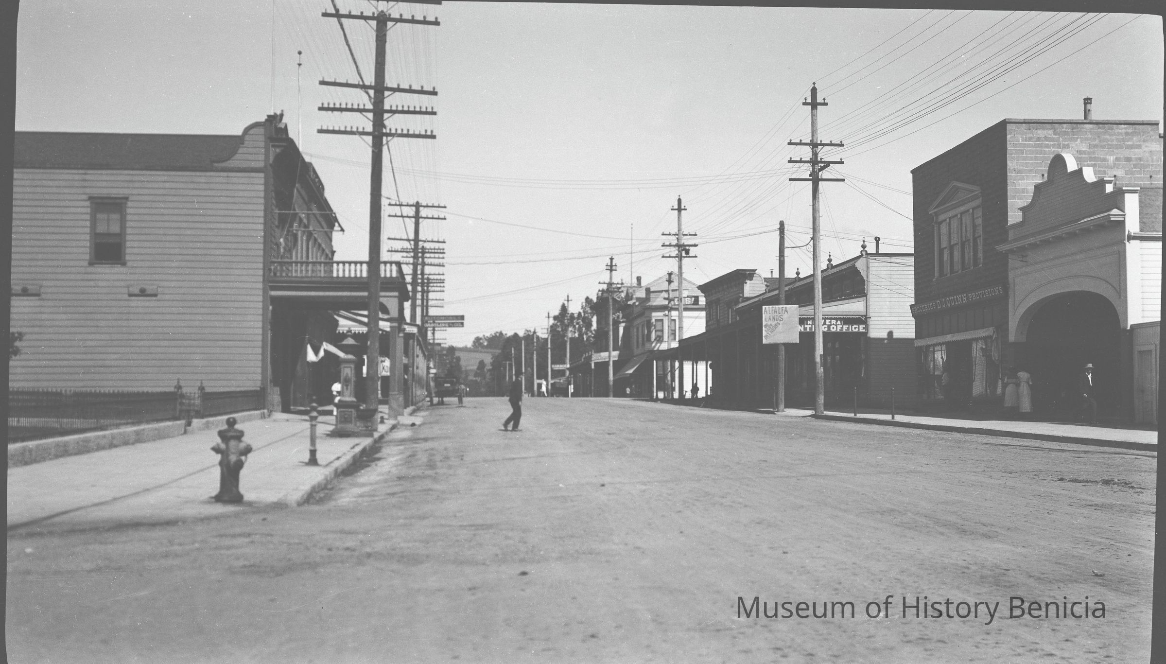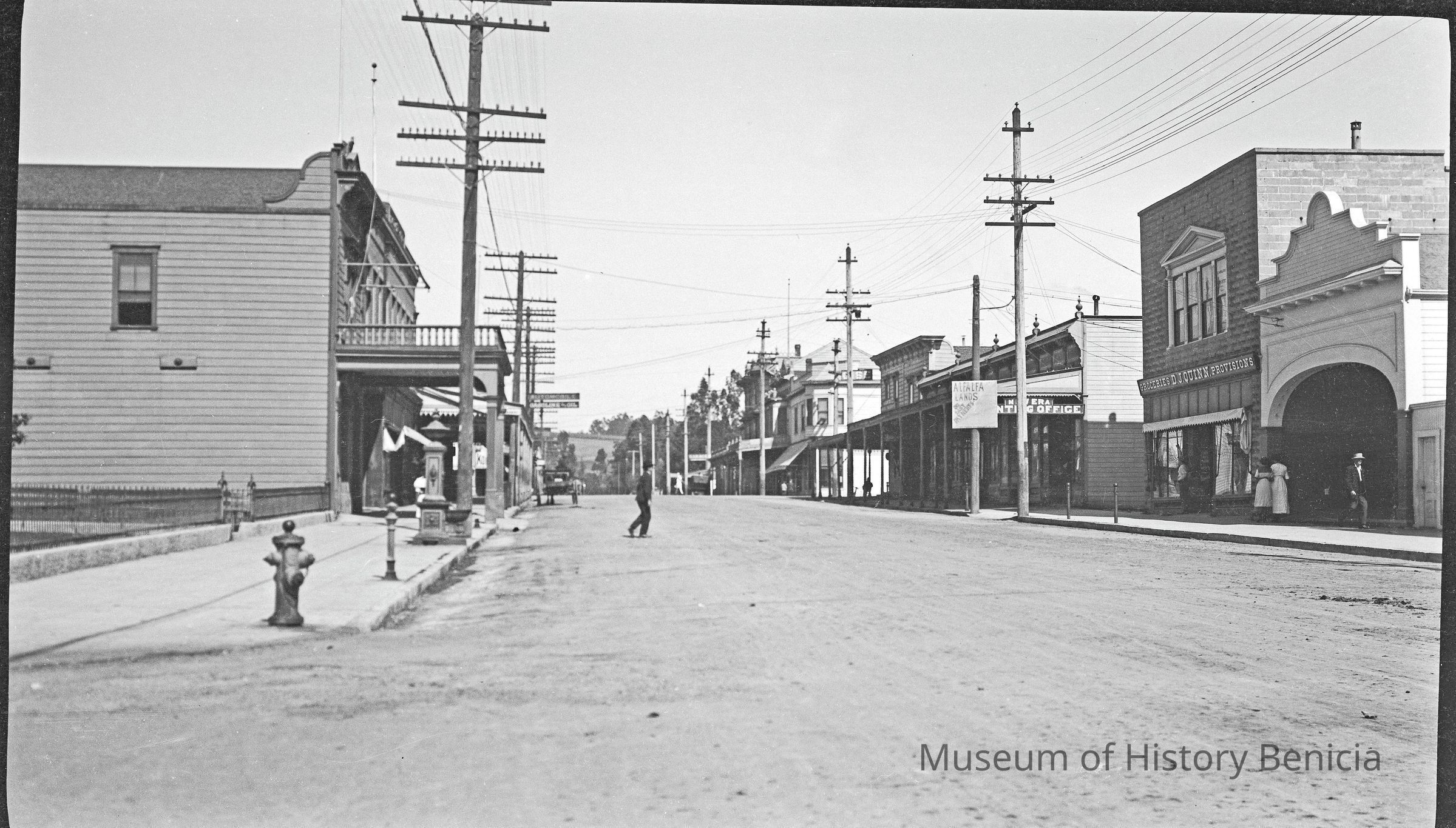 This photo shows First Street in Benicia. It shows a man walking across the street and a few horse drawn carriages. On the right in the photo is the New Era newspaper/printing office, an advertisement for "Alfalfa Lands" and Quinn's groceries. On the left a garage sign can be seen.Collection