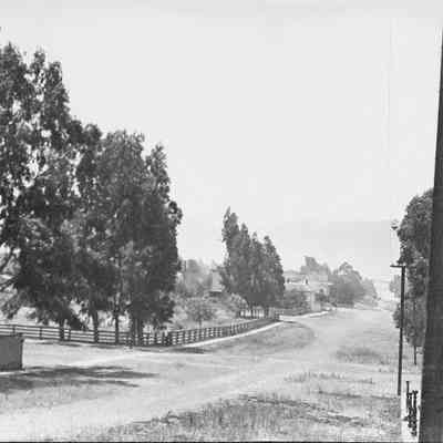 This is a photograph of a tree lined country road with a white fence along one side. There are steps up to a house on the right and a house in the distance.Collection