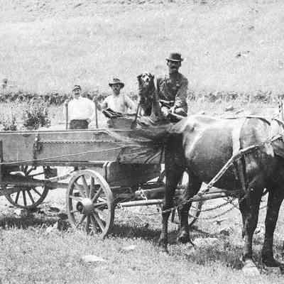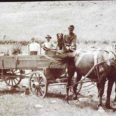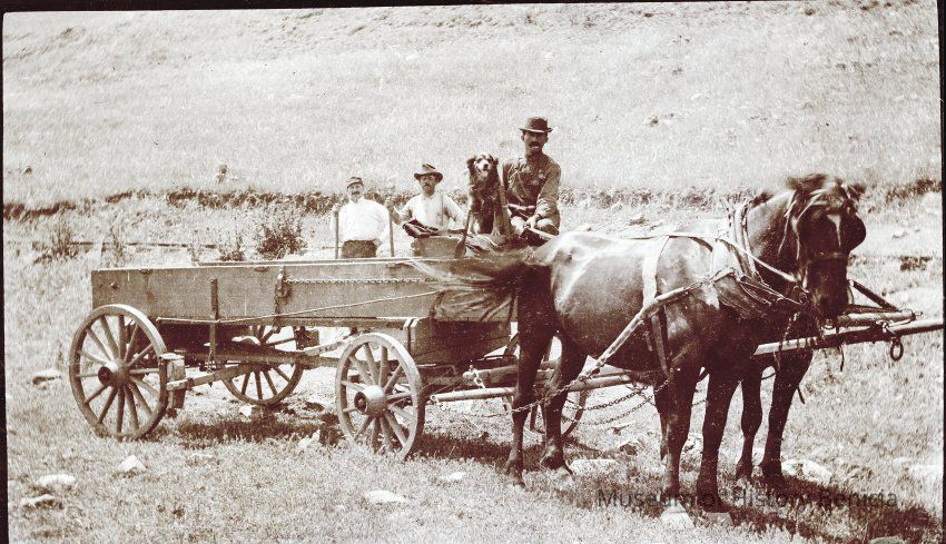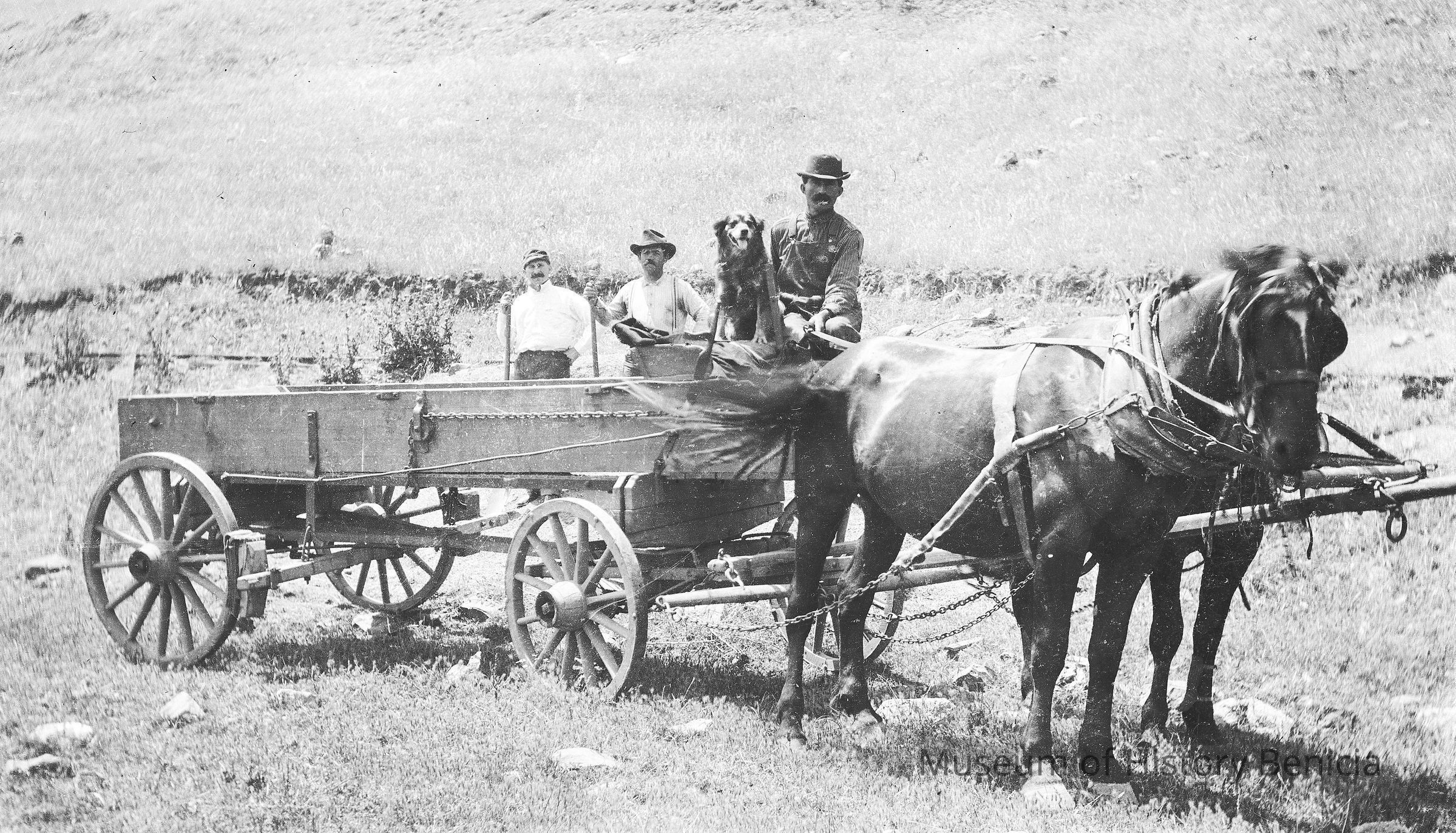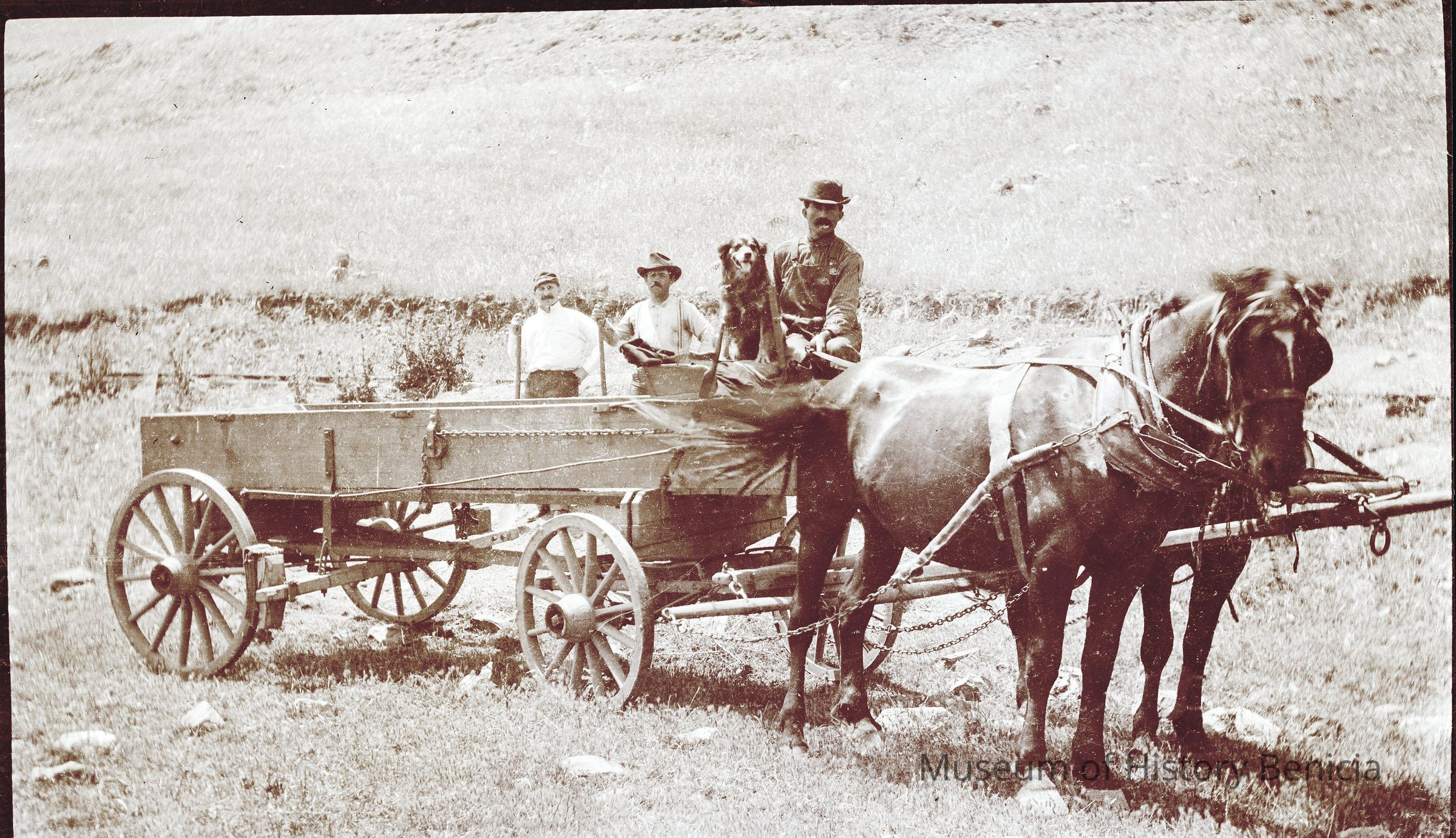 Men and a dog in a buckboard wagon.