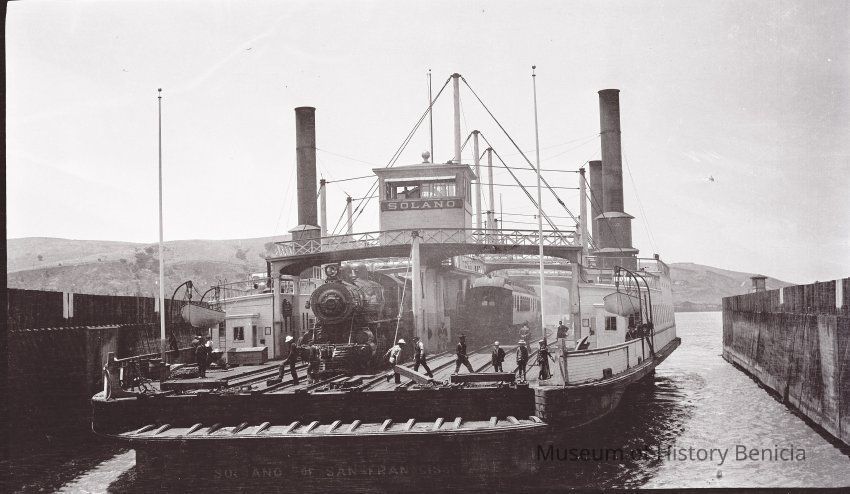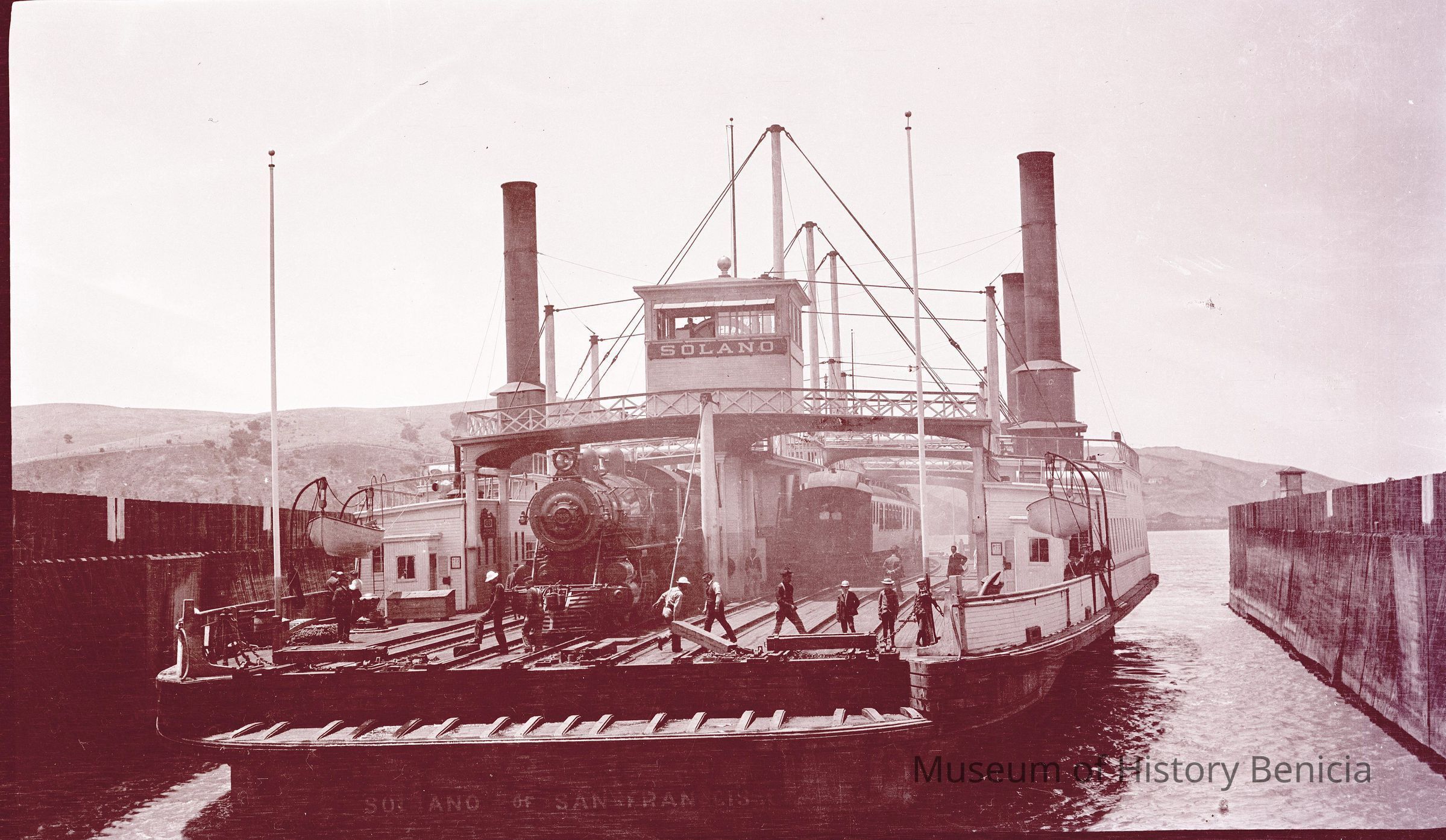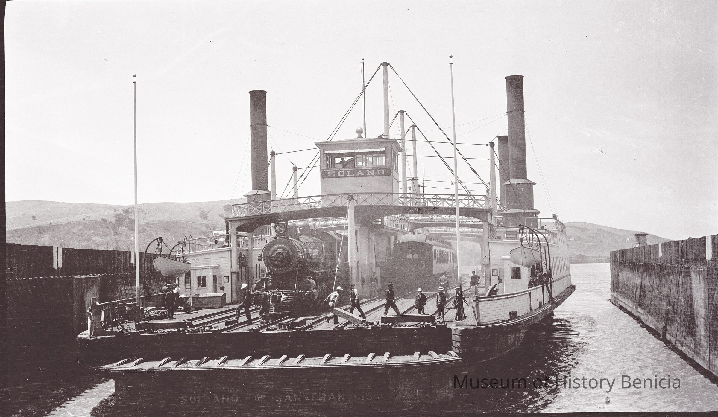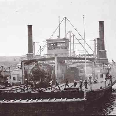 This negative is of the ferry Solano with a train engine and cars loaded on board.Collection