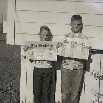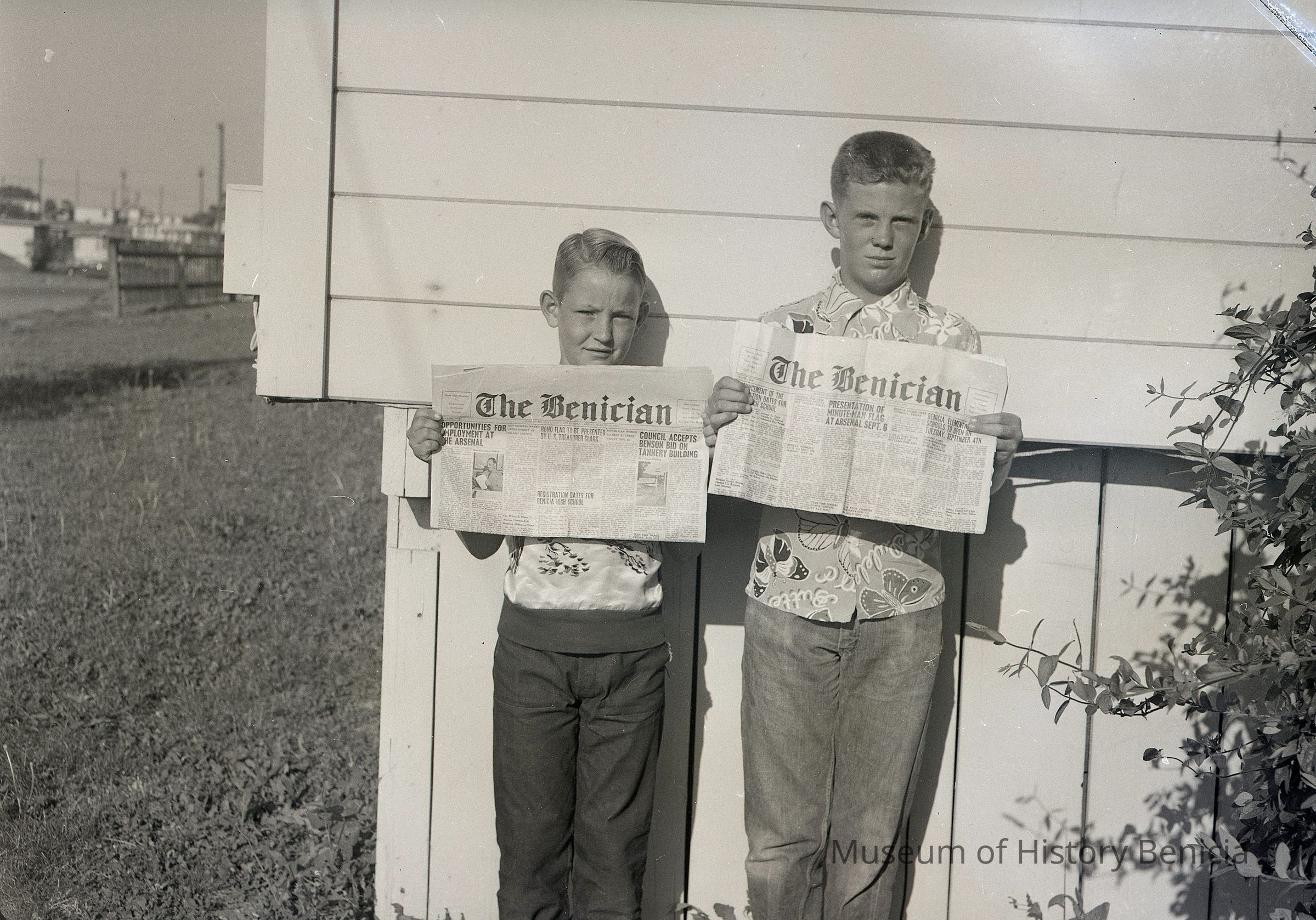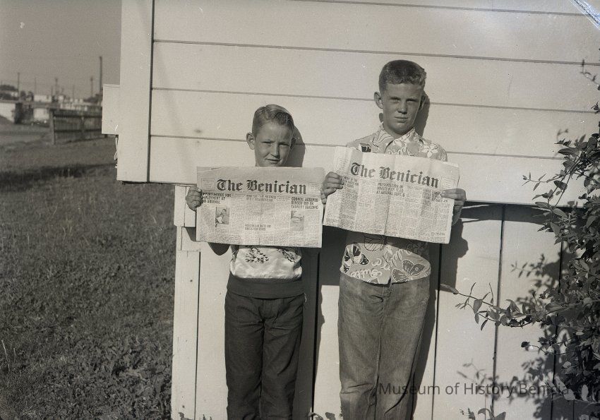 B/W Negative: two young men (probably news carriers/delivery boys) holding copies of the newspaper "The Benician". The papers are different editions but the dates cannot be determined. One paper has the date Friday, August, 24th. August 24th fell on a Friday in 1956.
