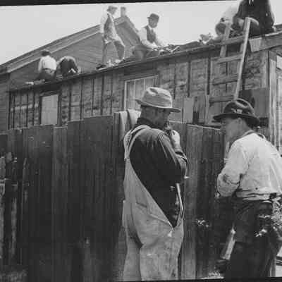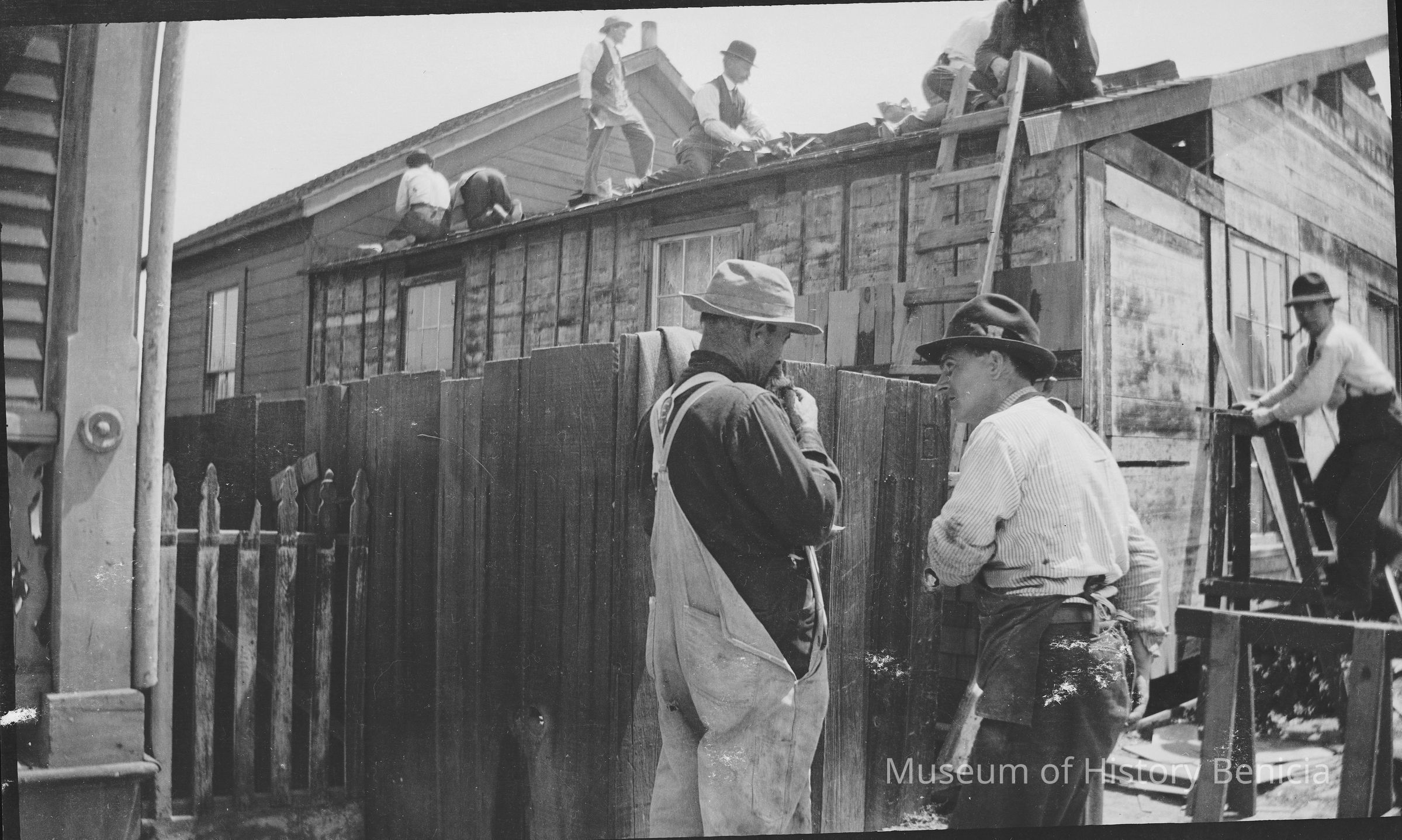 This is a photo of men building a house or barn.