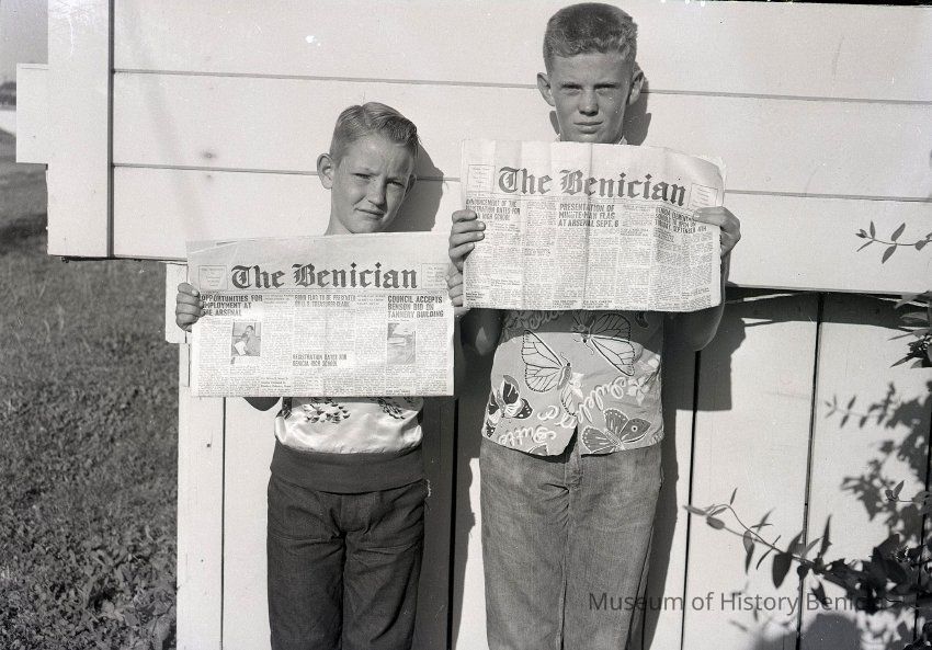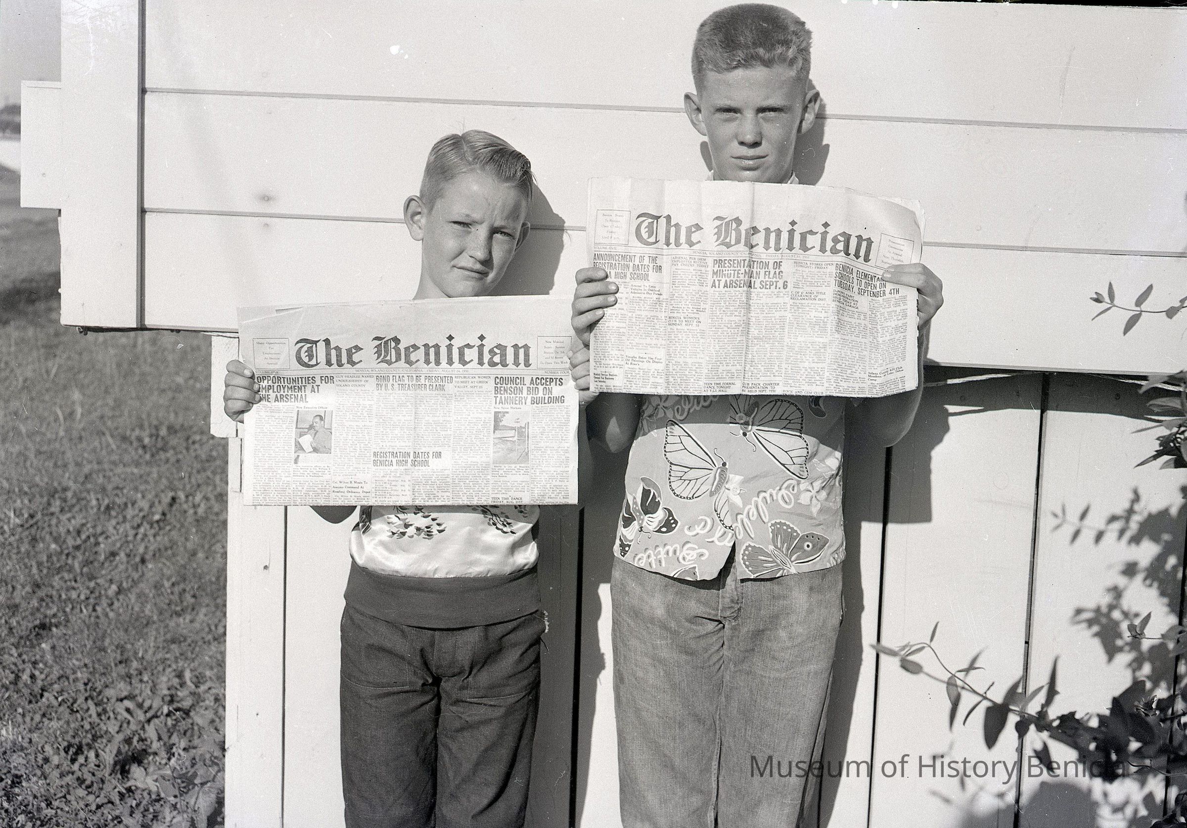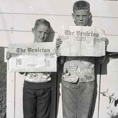 B/W Negative: two young men (probably news carriers/delivery boys) holding copies of the newspaper "The Benician". The papers are different editions but the dates cannot be determined. One paper has the date Friday, August, 24th. August 24th fell on a Friday in 1956.Collection