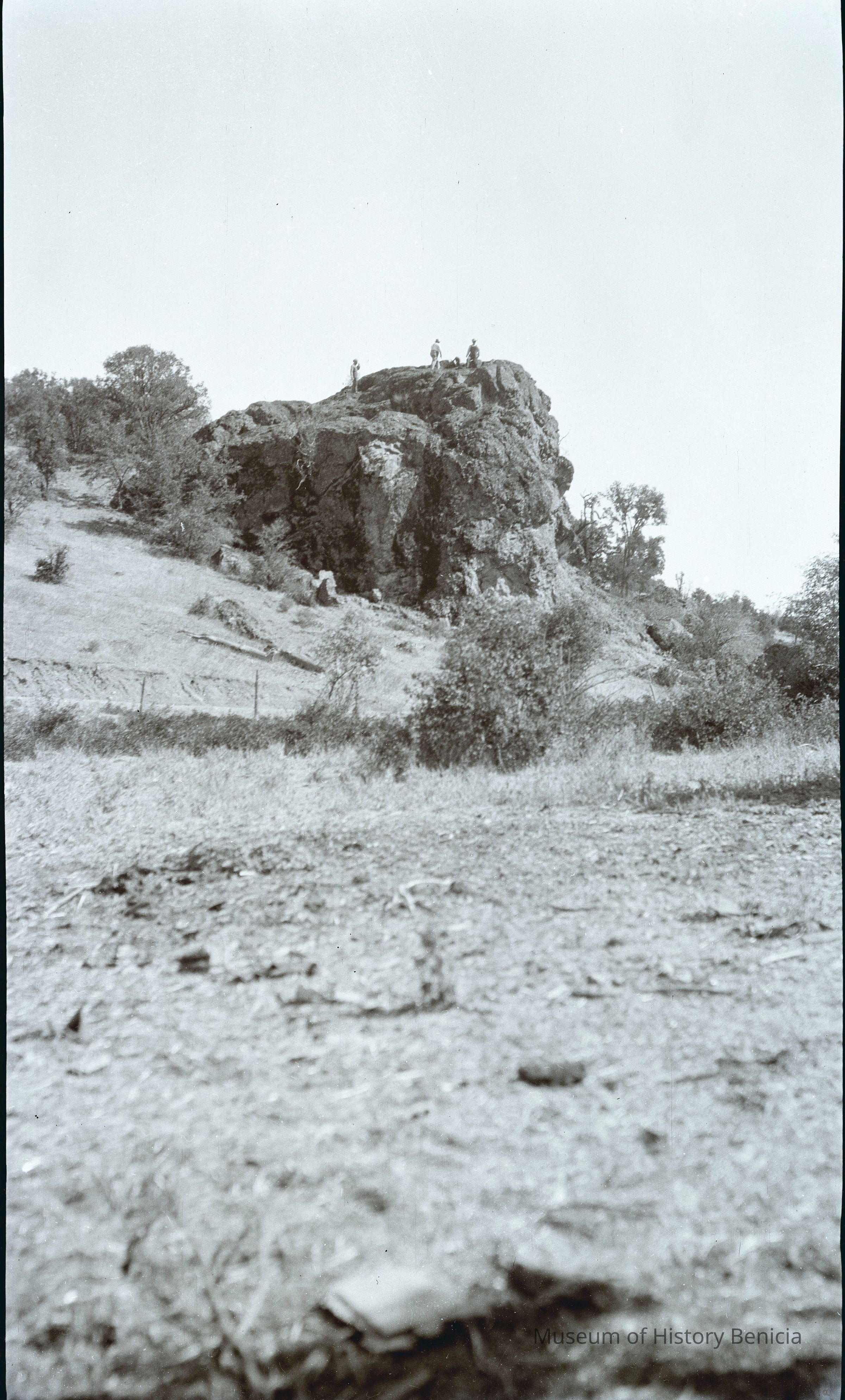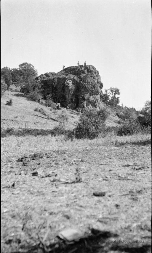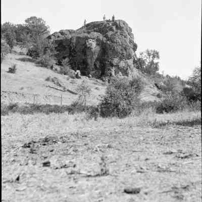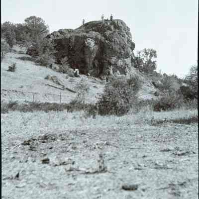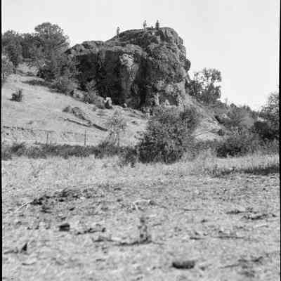 This photo shows men on top of a rock. The next photo shows them walking towards the rock.