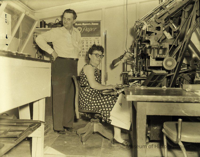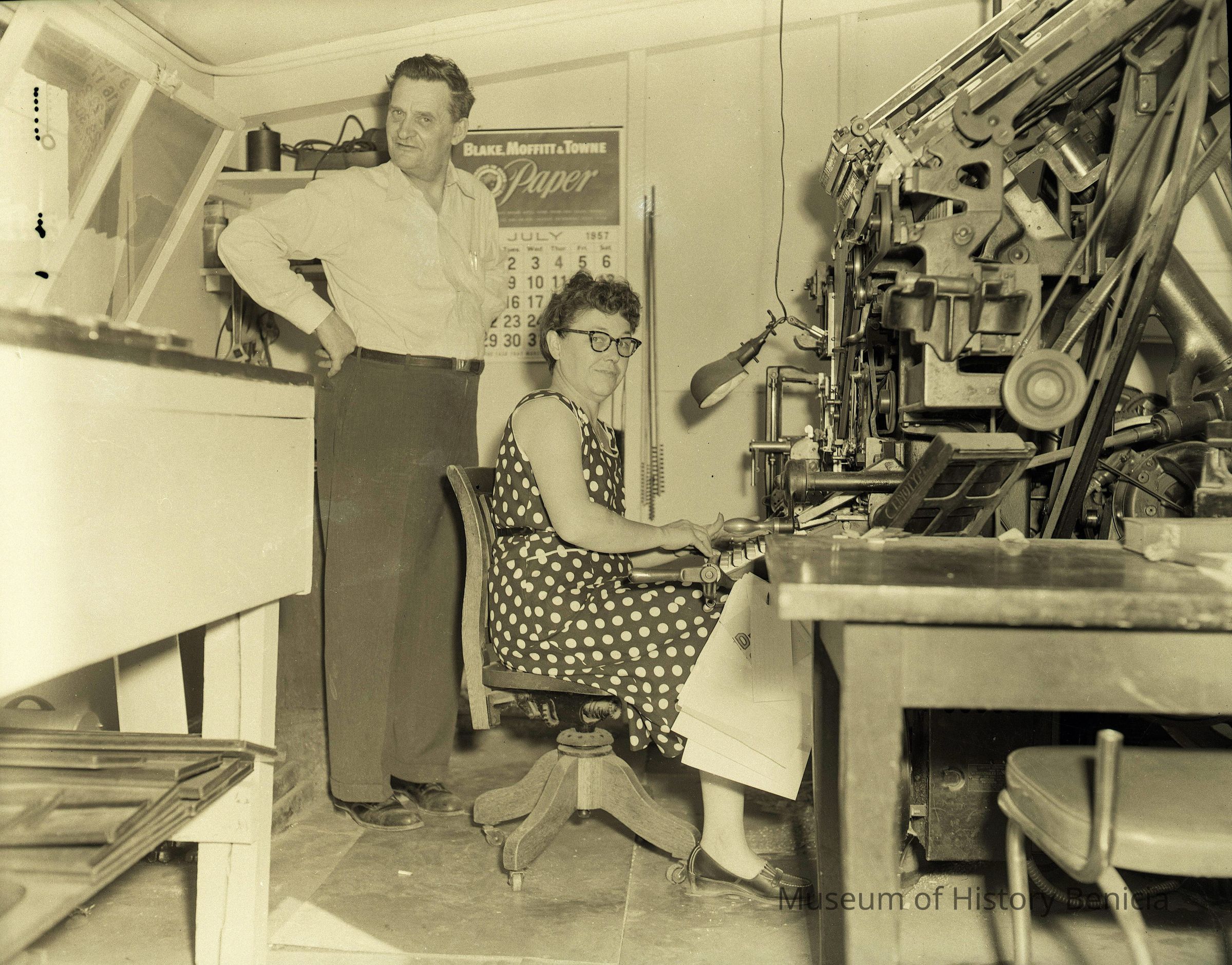 B/W Negative: Don and Vada Frane in their Benician newspaper office. Don is standing and Vada is seated at the linotype machine.Collection