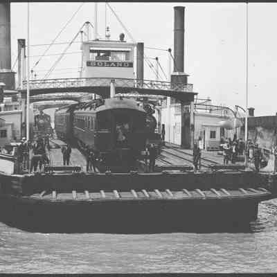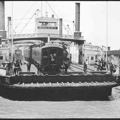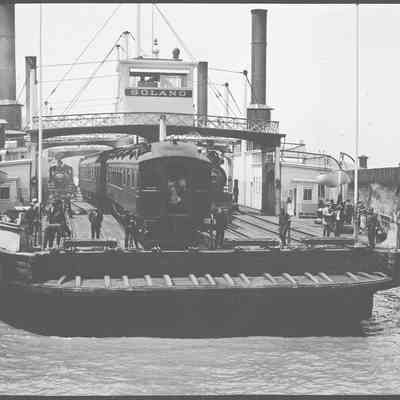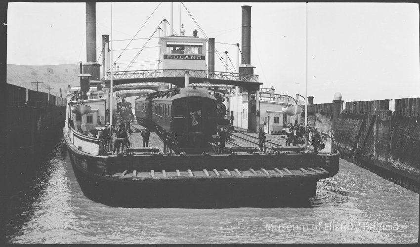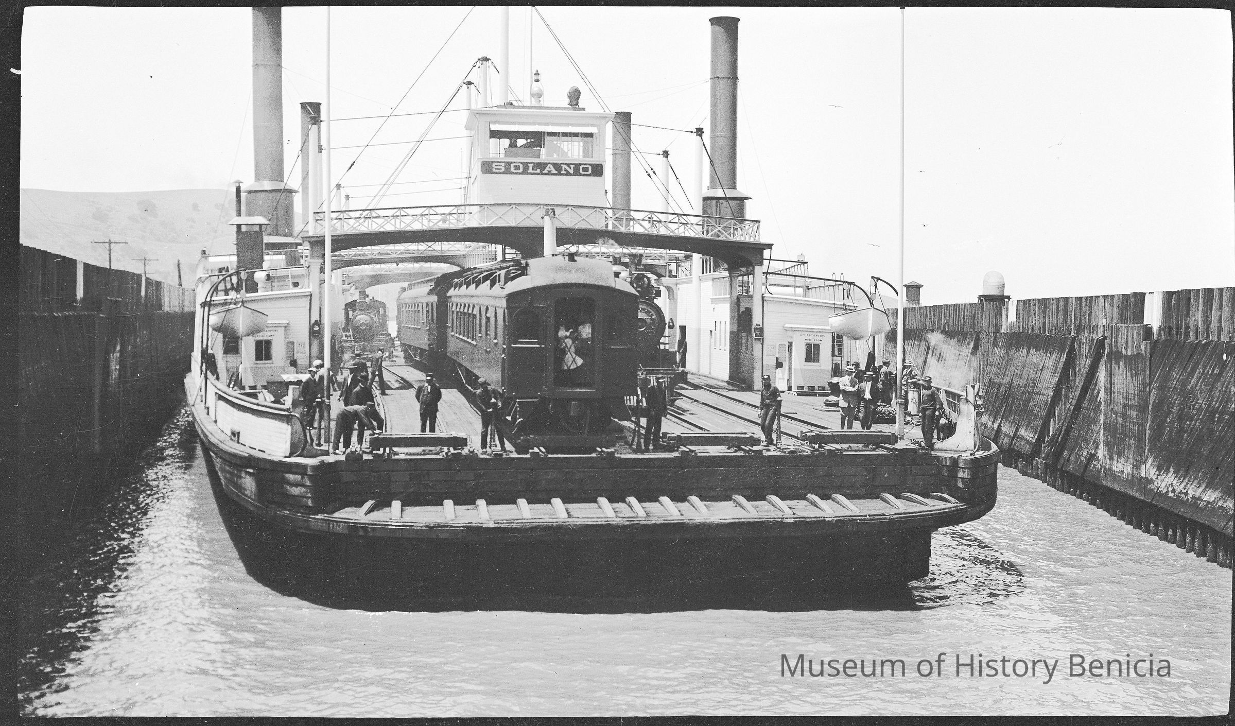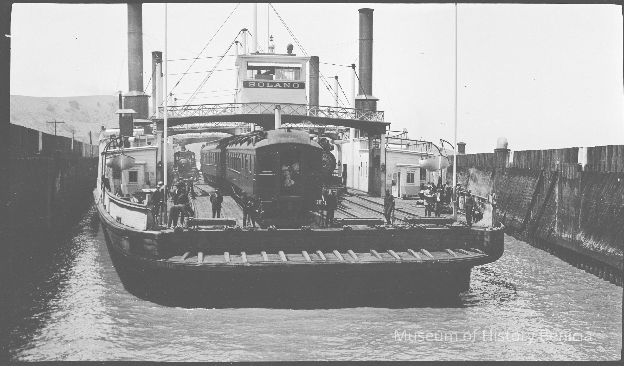 This photo shows the ferry Solano coming into port in Benicia. There is a room on the left that says "life preservers / Restaurant". On the right it says "Life Preservers / Wine Room".Collection