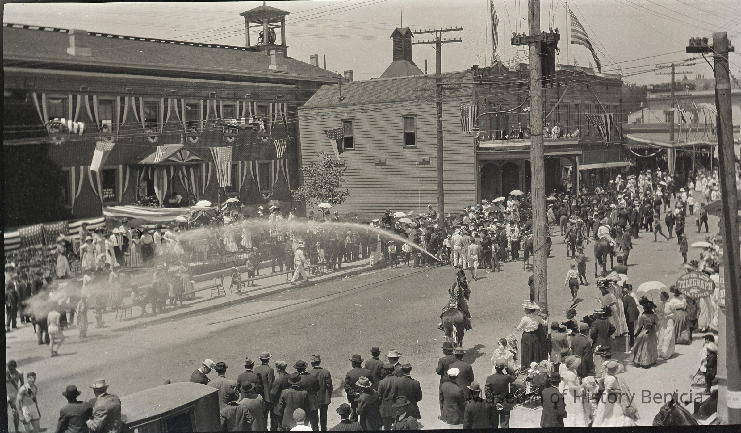 This is a photo of a 4th of July parade/muster in Benicia. The firemen are showing off a hose spraying demonstration and the crowds are watching. The Benicia High School track team is in the lower left and it looks like one of them is being sprayed. This is probably the early 1900's.Collection