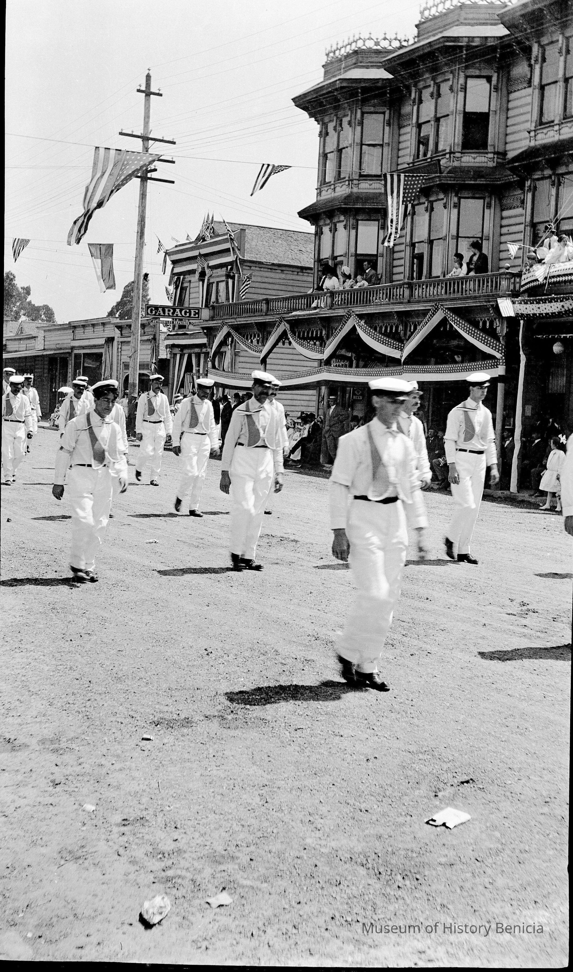 This is a photograph of a parade down First street in Benicia. There are men in uniform. They have small vests and a cap with a brim.Collection
