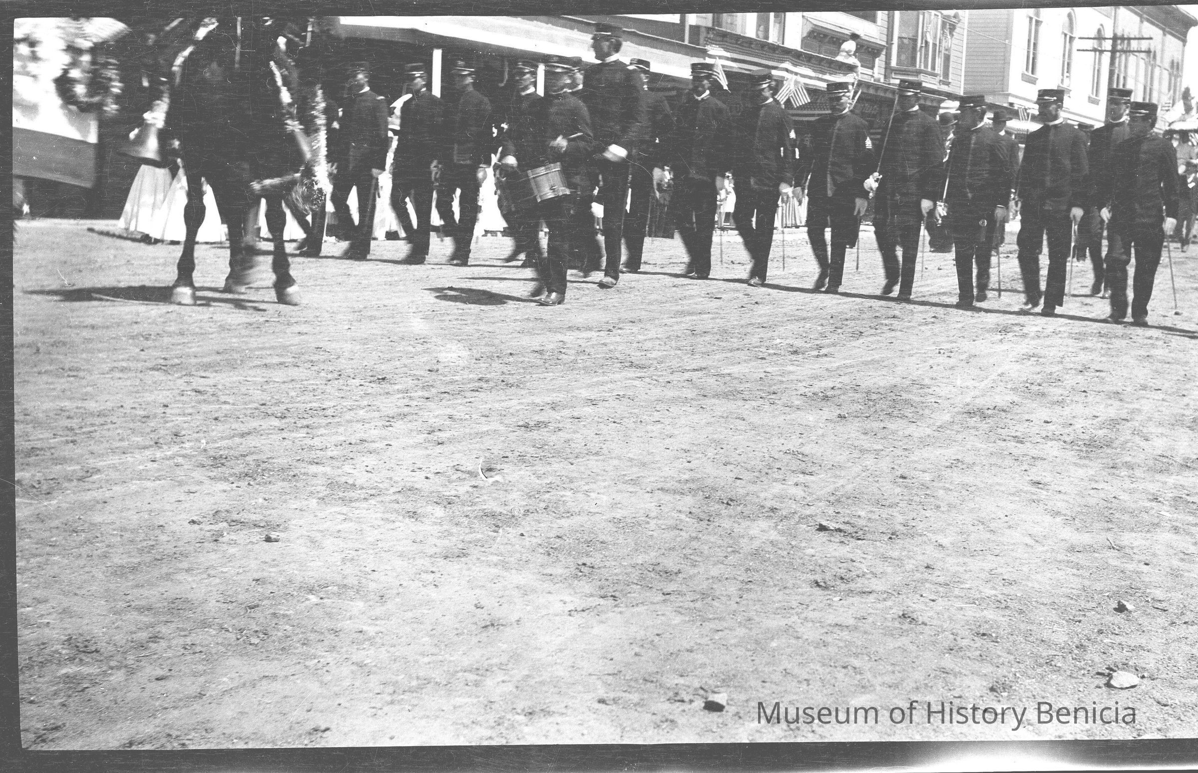 This is a photograph of a parade down First street in Benicia. It shows men in uniform marching behind someone on horseback and a drummer.Collection