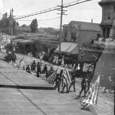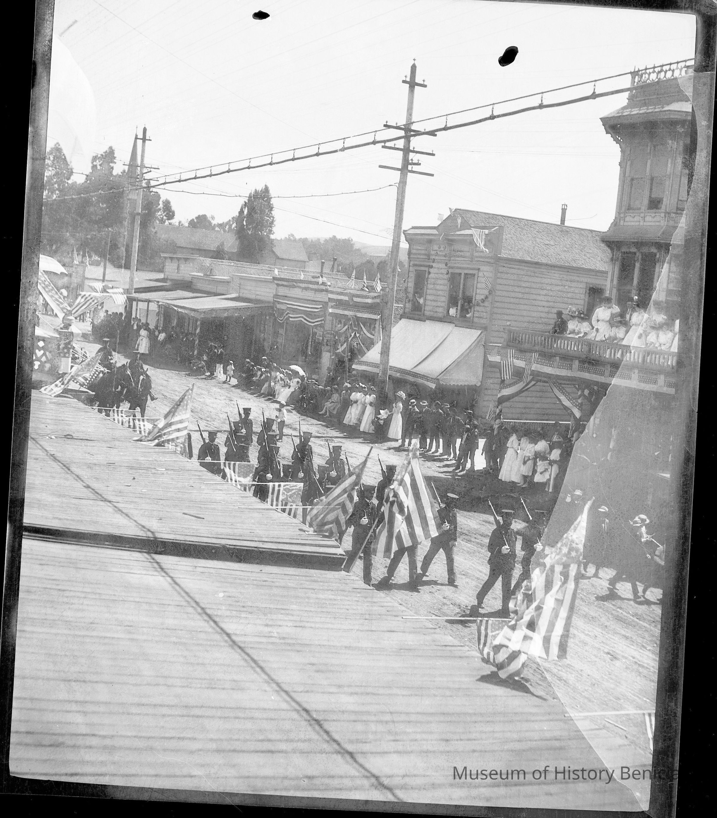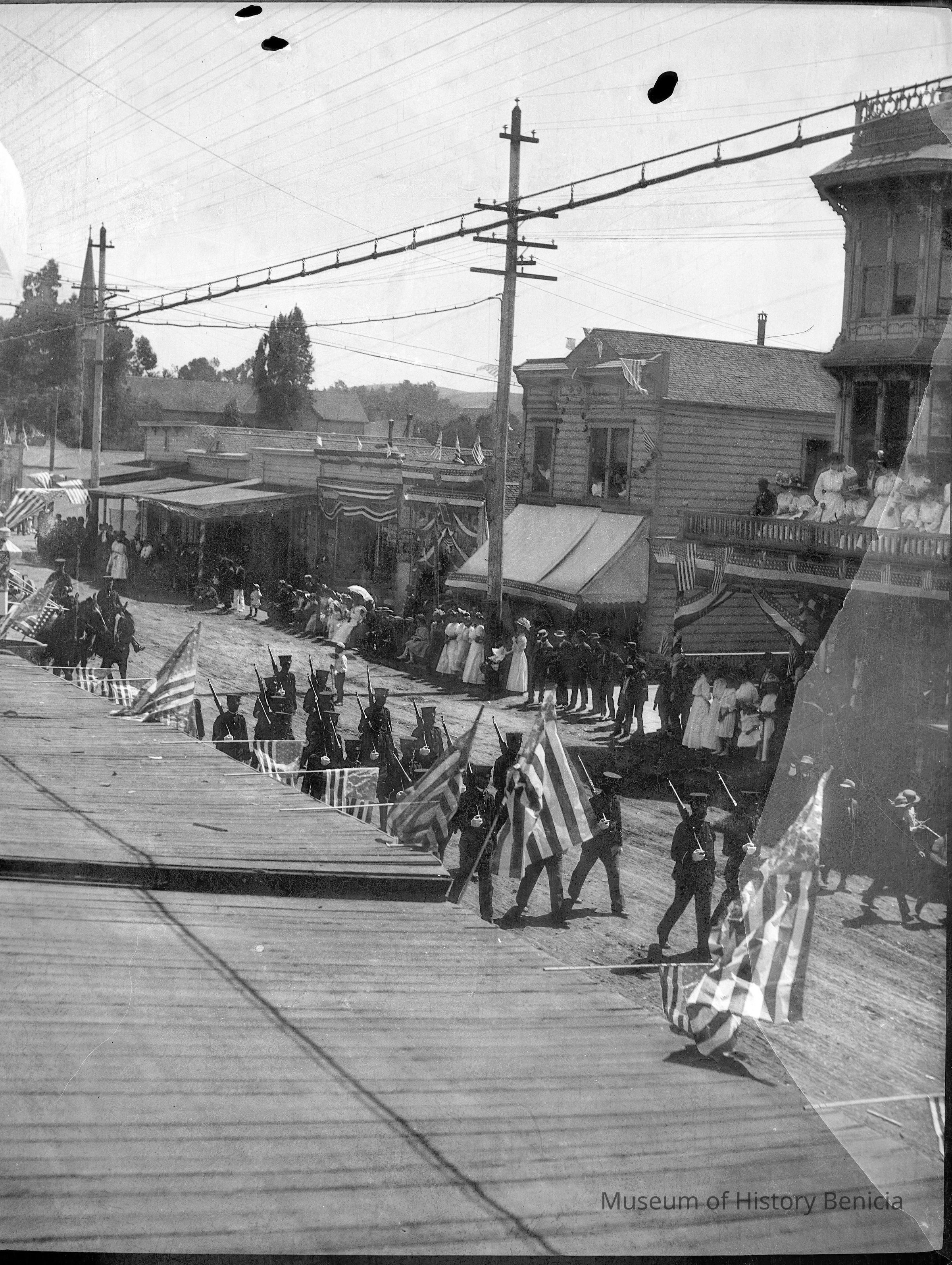 This is a photograph of a parade down First street in Benicia. It shows men in uniform marching down the street with guns over their shoulder. There are a number of people watching the parade from a balcony overlooking the street.Collection