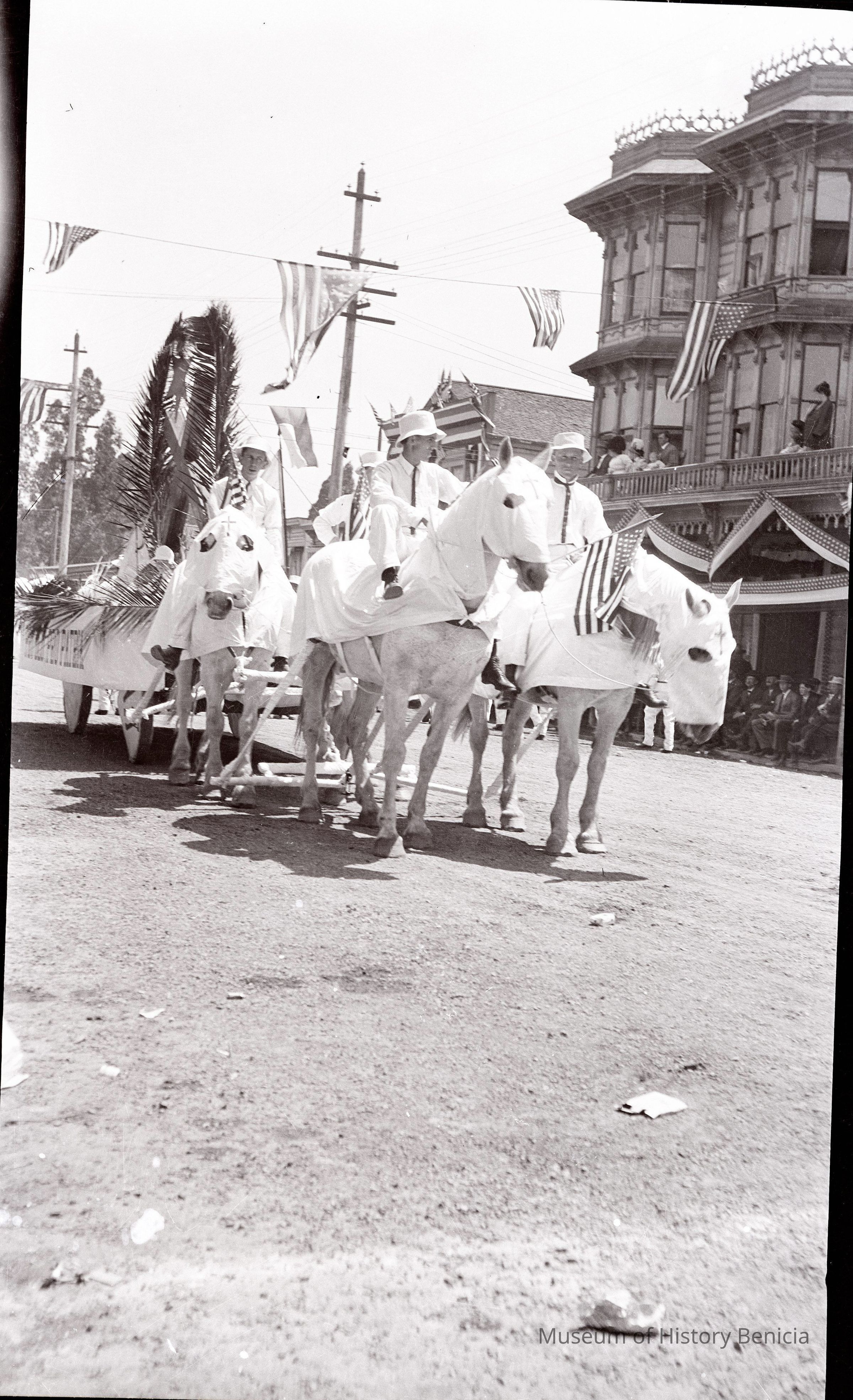 This is a photograph of a parade. This is negative of a cross being pulled by a horse and wagon. It seems to be a parade. On the side of the wagon is "Pro Deo. Pro Patria" which means "For God For Country". The wheels have the initials YMI which stands for the Catholic youth organization "Young Men's Institute".Collection