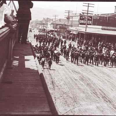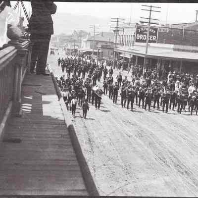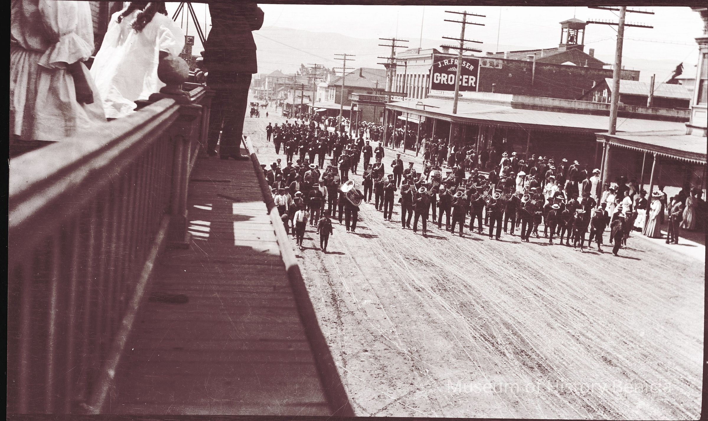 This is a photograph of a parade n Benicia. The band is marching up the street. In the background is a sign for J. K. Fraser Grocery and underneath that sign is "Sanborn & Chisholm".Collection