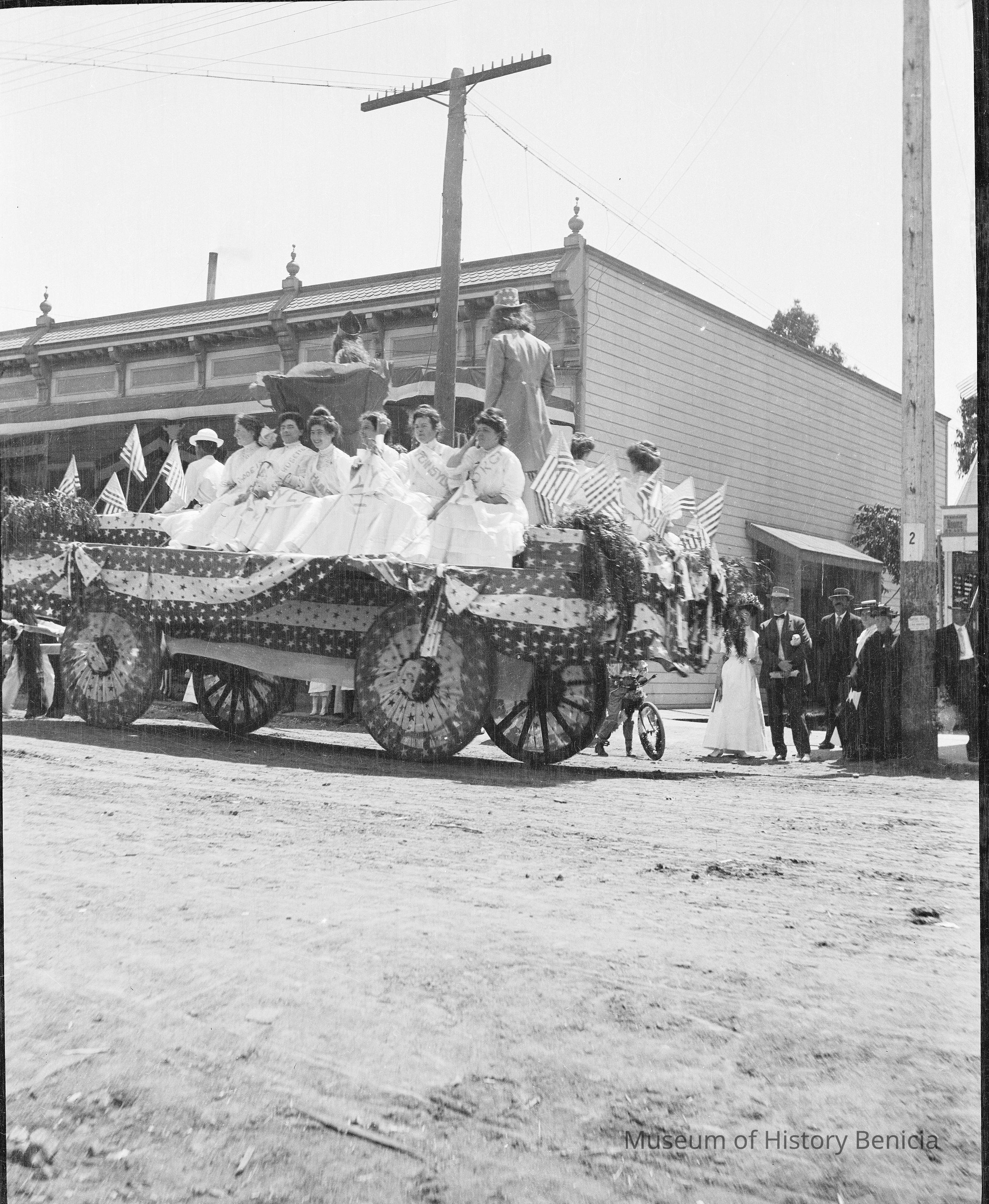 This is a photograph of a parade down First street in Benicia. There are young ladies on a wagon.