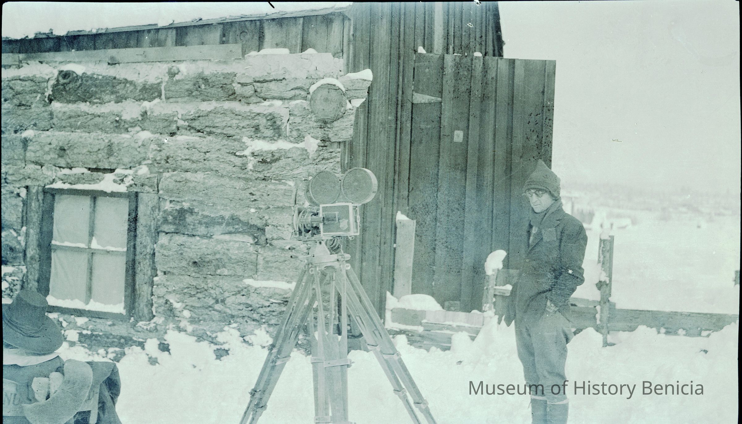 This negative shows a snow scene probably in Nevada. They are shooting a movie. The date is about 1910-1920. Not sure of the movie but the Truckee History Center lists dozens of movies that were shot in that area.Collection