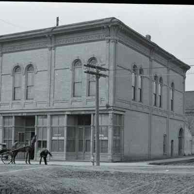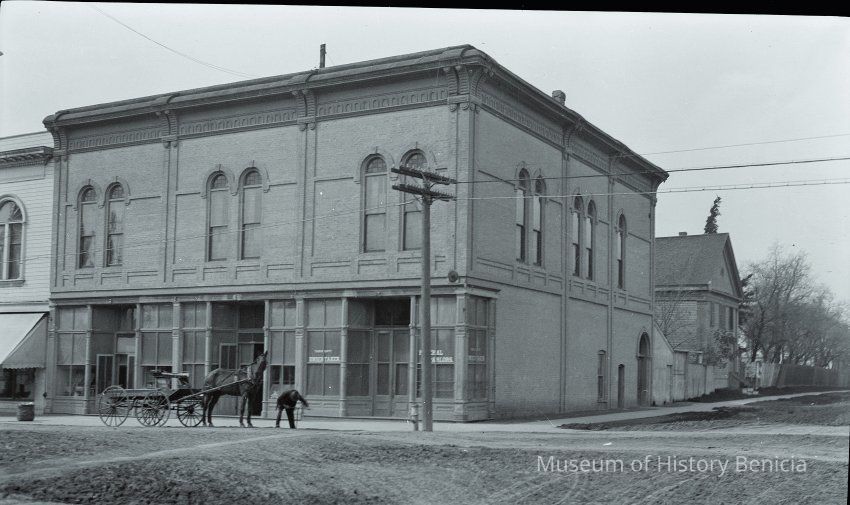 This is a negative of the Masonic Hall in Benicia. There is a horse and buggy in front.