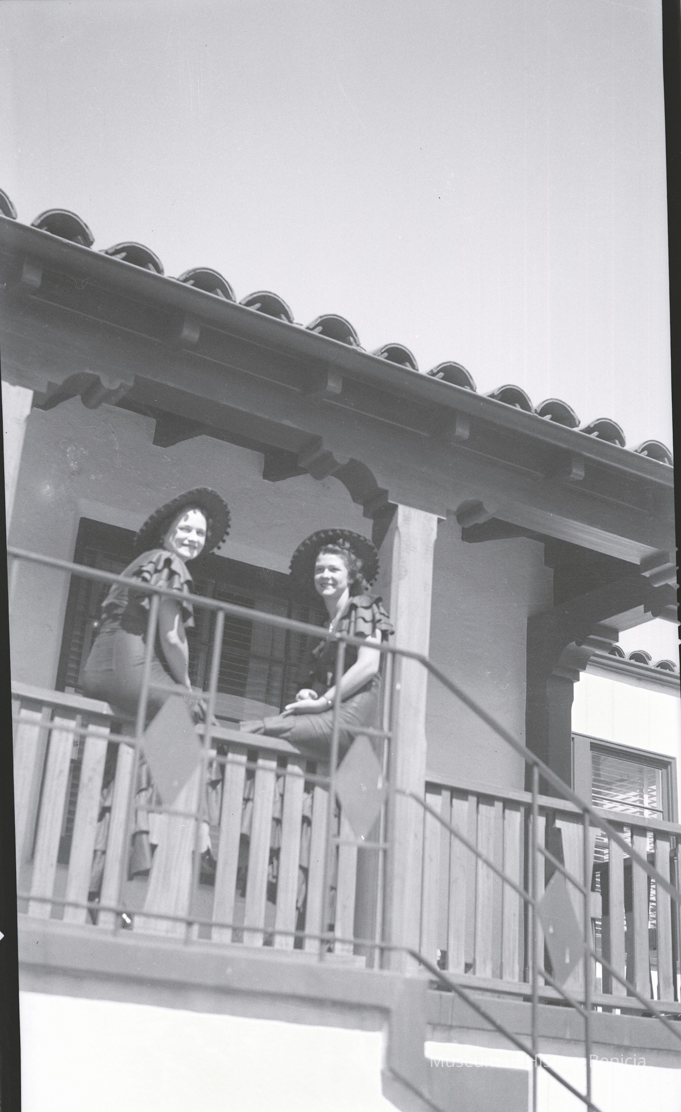 This negative shows a railing on a structure with a tile roof and two women sitting outside.