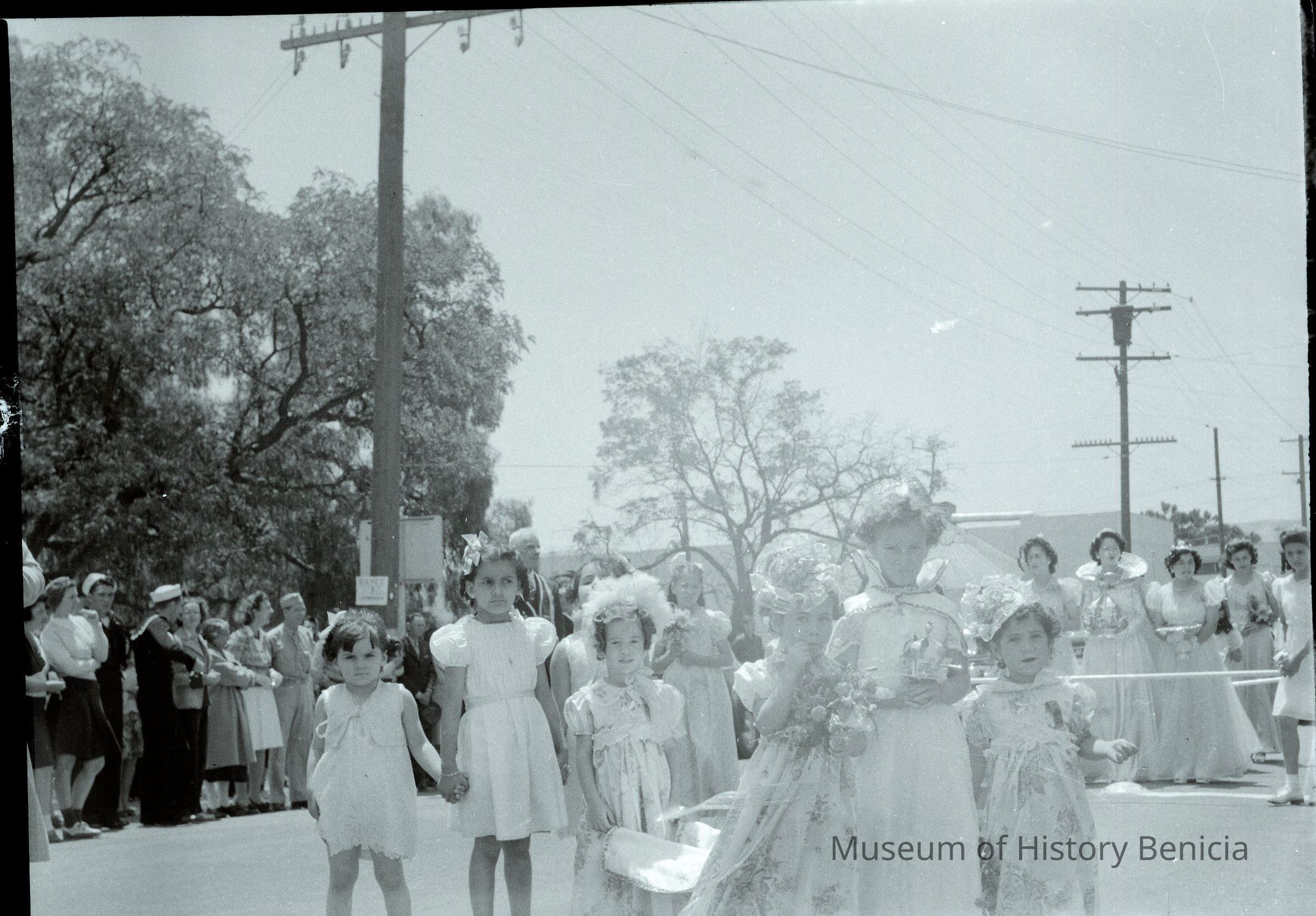 This negative shows young girls marching down First Street. It looks like the Portugese parade.