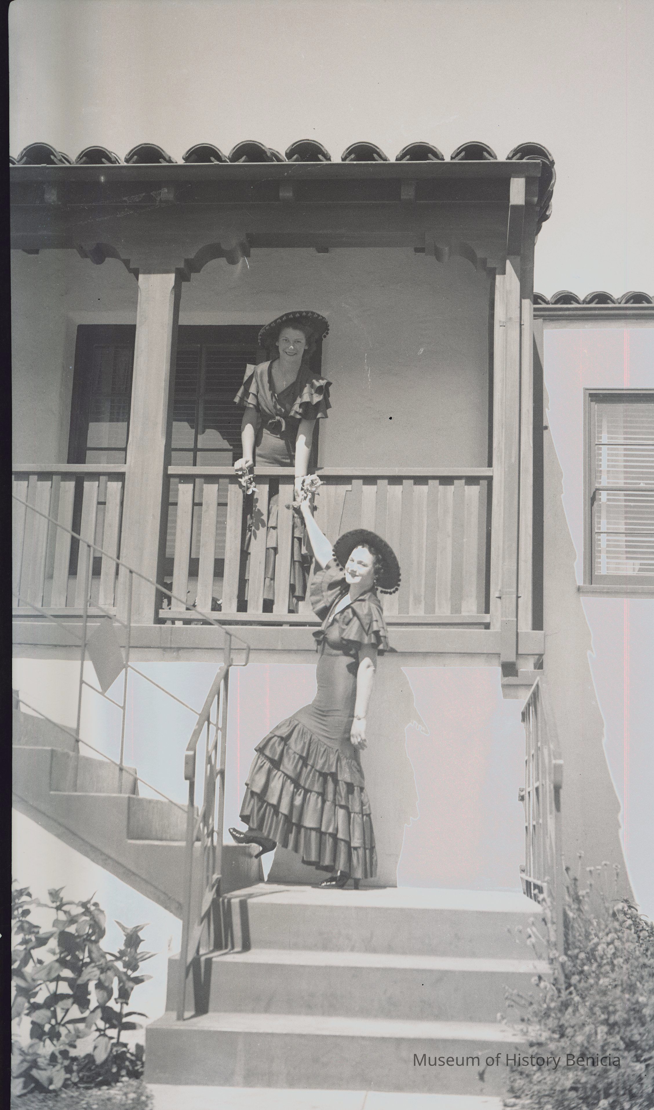 This negative shows a railing on a structure with a tile roof and two women outside. One is on the stairs and reaching up to the other woman.Collection