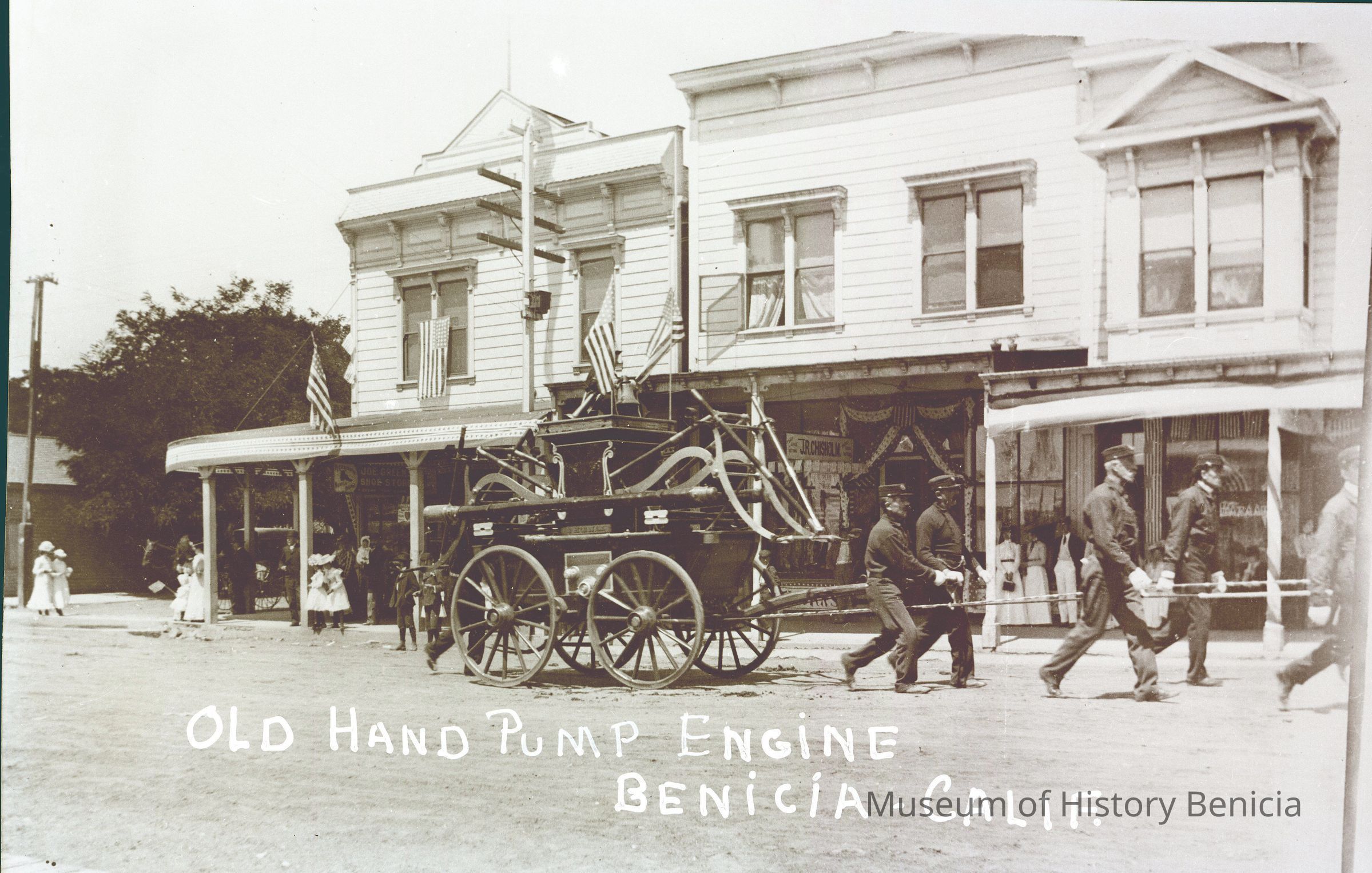 This is a negative of an old hand fire pumper wagon from the Benicia fire department.