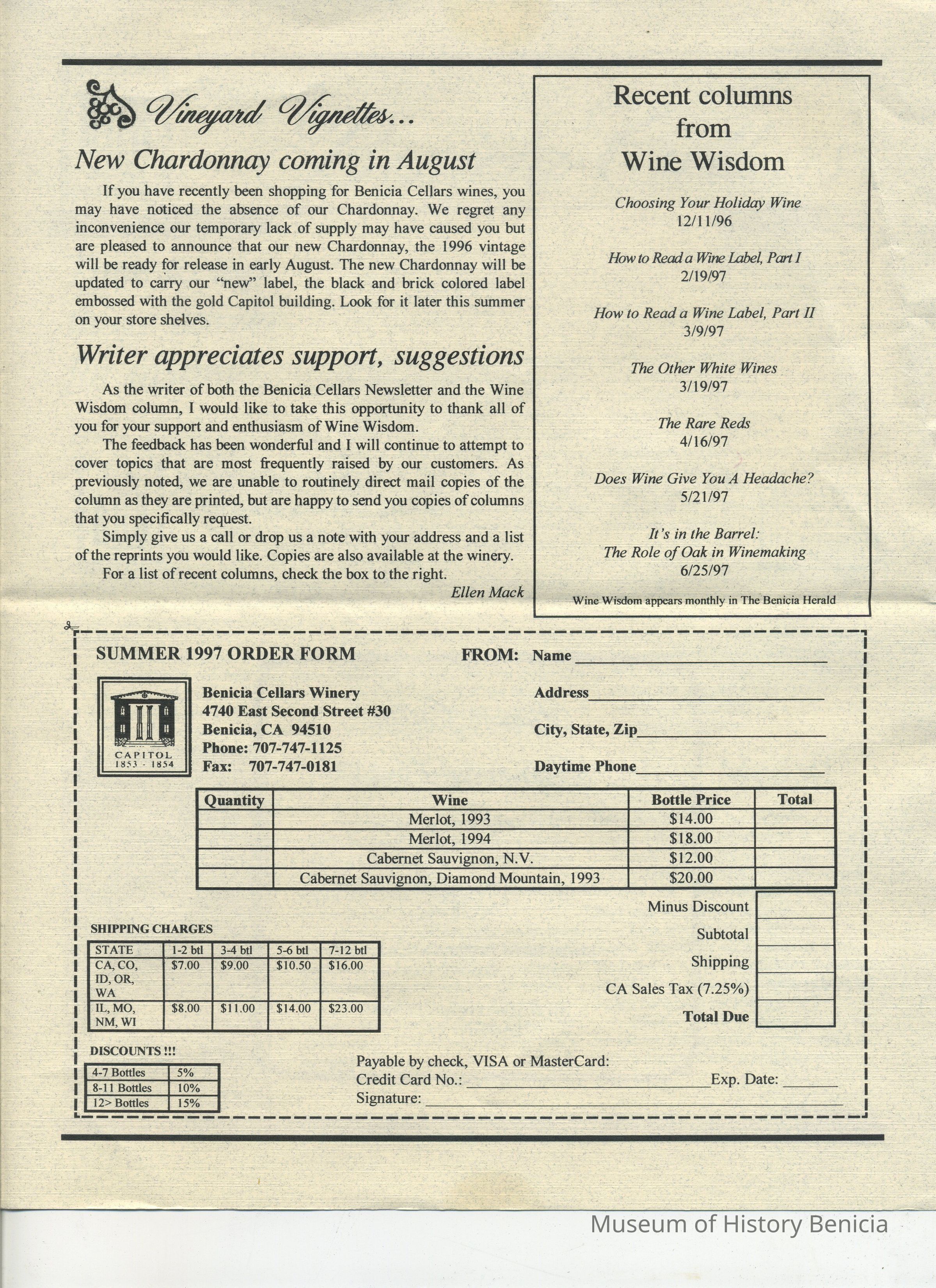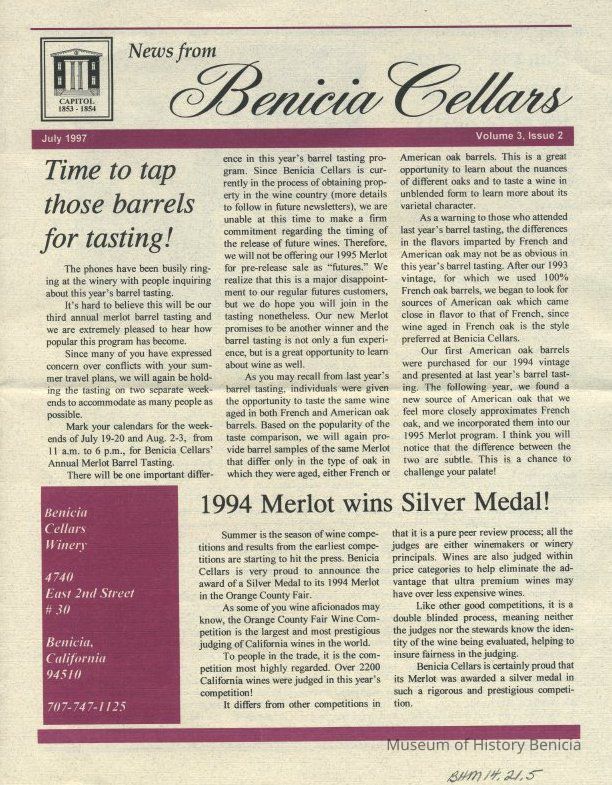 Benicia Cellars Newsletter