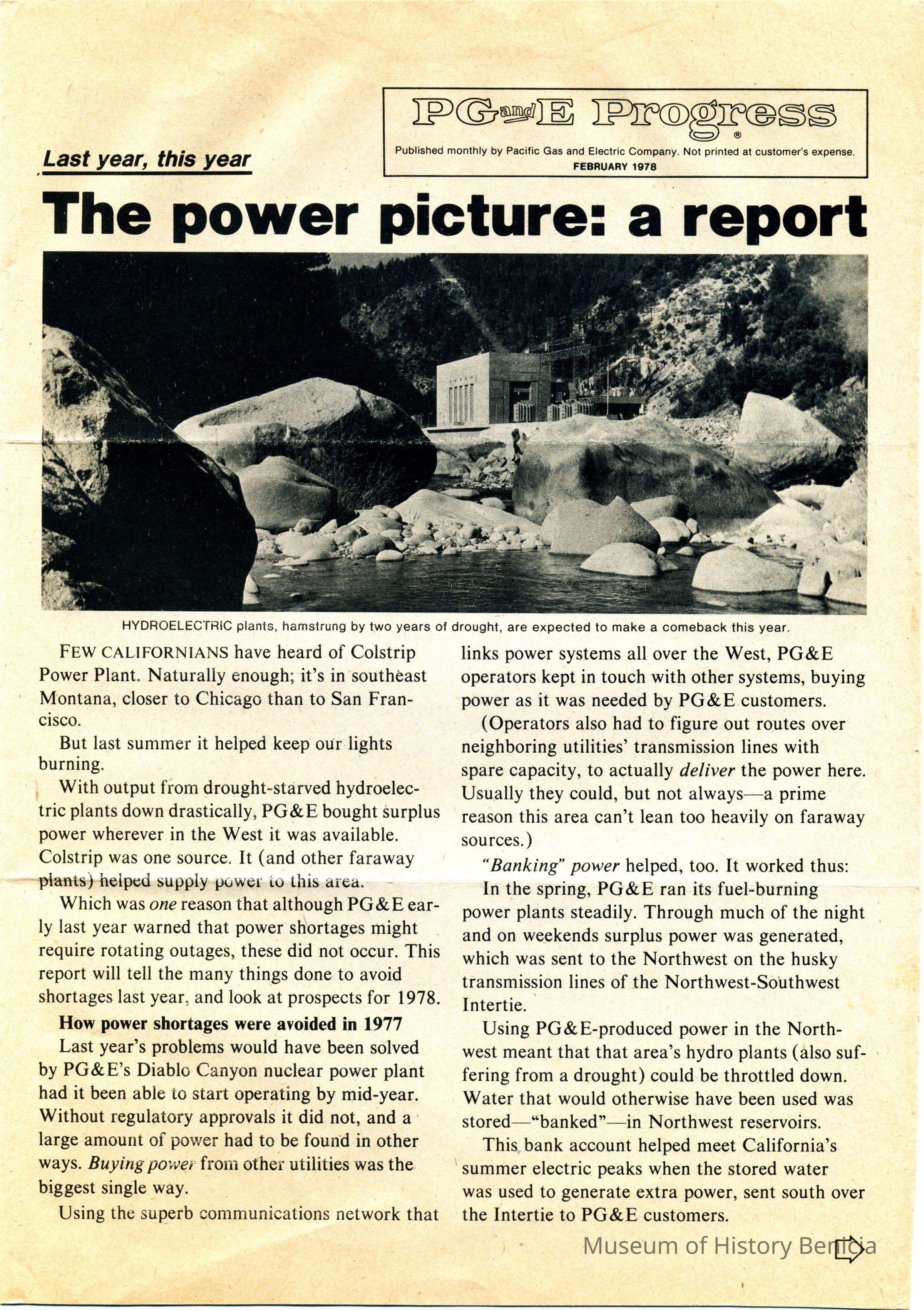 A newsletter from PG&E dated 02/1978. It contains an article on Benicia. It also contains an article called "Electricity comes to California".Collection